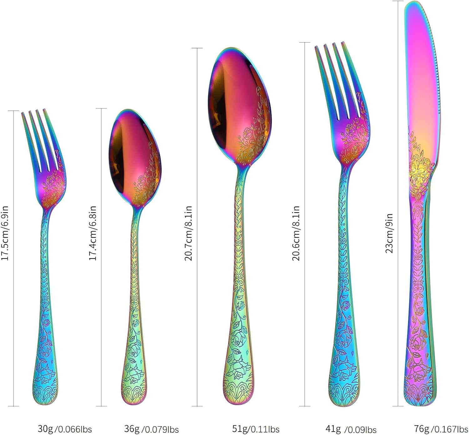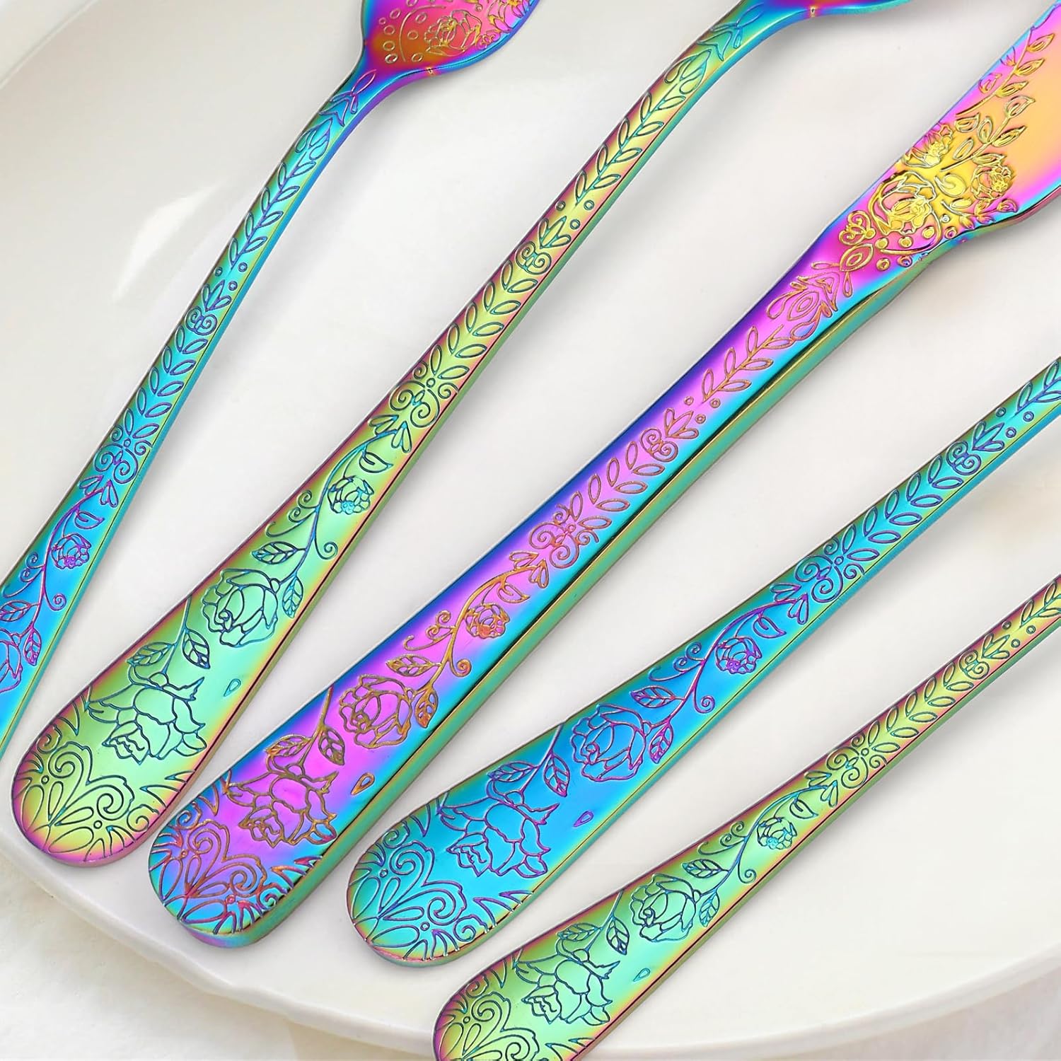 • ORNATE DESIGN rainbow flatware set colorful stainless steel silverware: This vintage retro silverware set is a true work of art, with intricate and ornate designs that exude opulence and sophistication. Each piece is crafted from quality material, making it not only beautiful, but durable and long-lasting as well