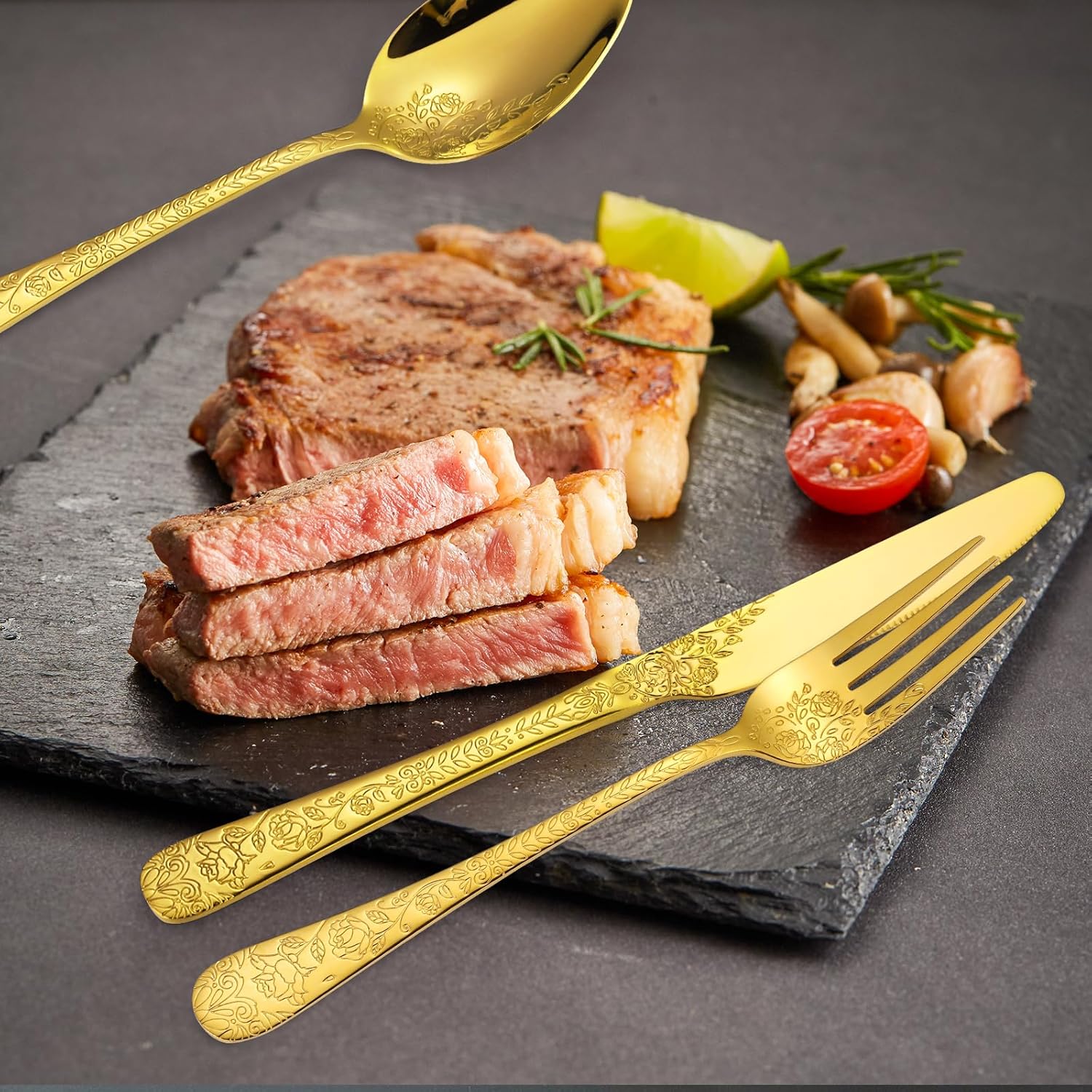• QUALITY MATERIAL: This Gold Cutlery Set Vintage flower embossed Relief is beautifully crafted from quality materials and is enhanced with a stunning hollow relief design. It is designed specifically for adding a touch of elegance to your dining experience