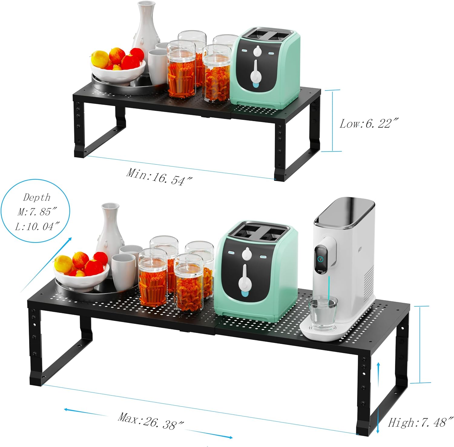 • ⭐[Expandable & Stackable independent Cabinet Organizer]The Cabinet shelf length is flexible, it can be extended from 16.54~26.38" depending on how you want to organize your space (16.54"~26.38"L x 7.85/10.04"W x 6.22~7.48"H).You can use it alone, or multiple shelves stacked together to store your goods. To improve the storage space of the cabinet and max the storage efficiency.