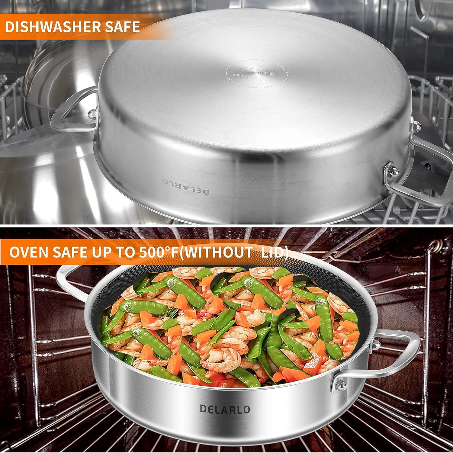 • 【HEALTHY MATERIAL】DELARLO Saute Pan are made up of high-quality ​stainless steel, which is highly durable, corrosion-resistant, and does not react with food to ensure healthy cooking