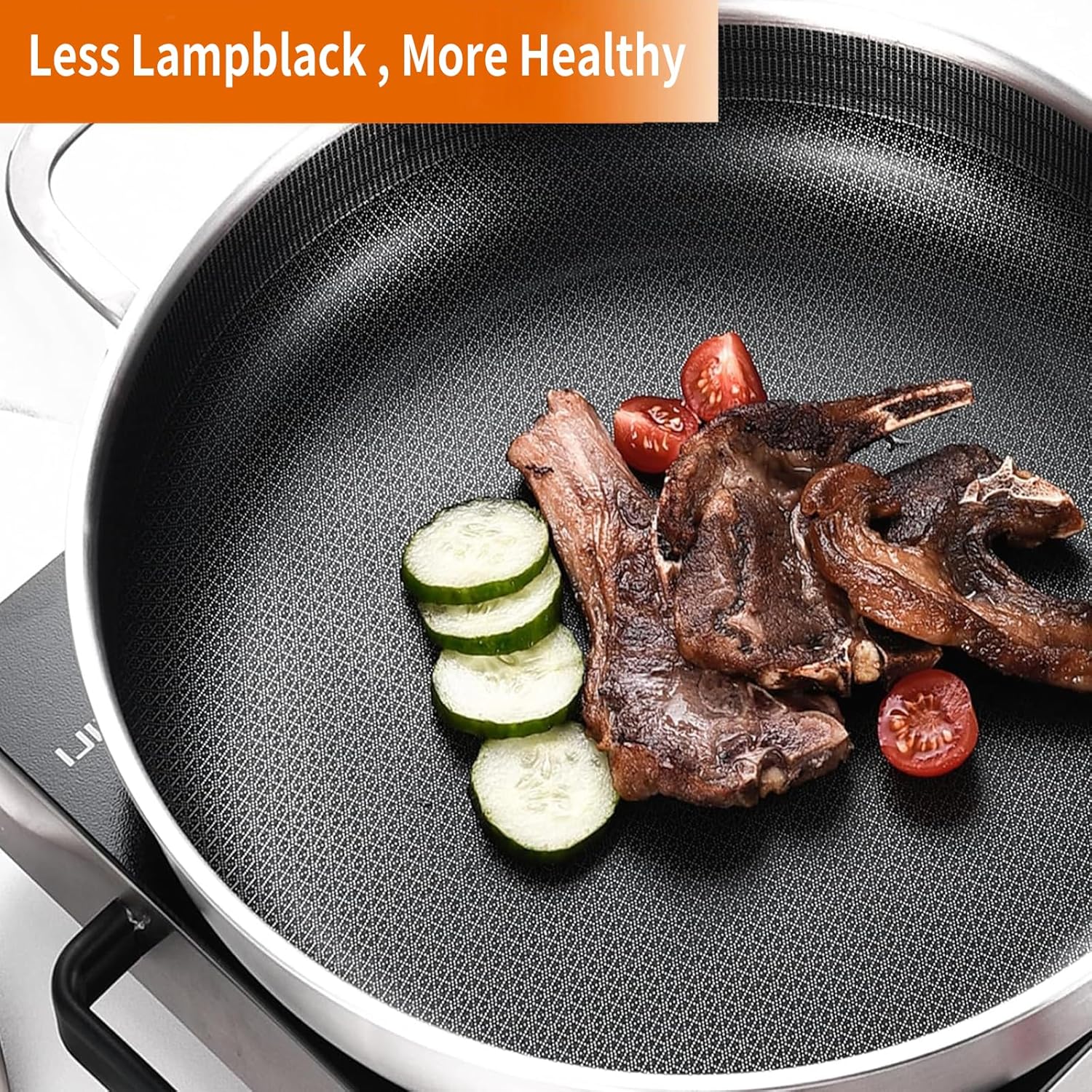 • 【FAST & EVEN HEATING】The entire fryingpan body is all tri-ply bonded construction ensures optimal heat distribution for fast even heating and energy saving,will spend 20% Gas or electricity less that you have spend in cooking before