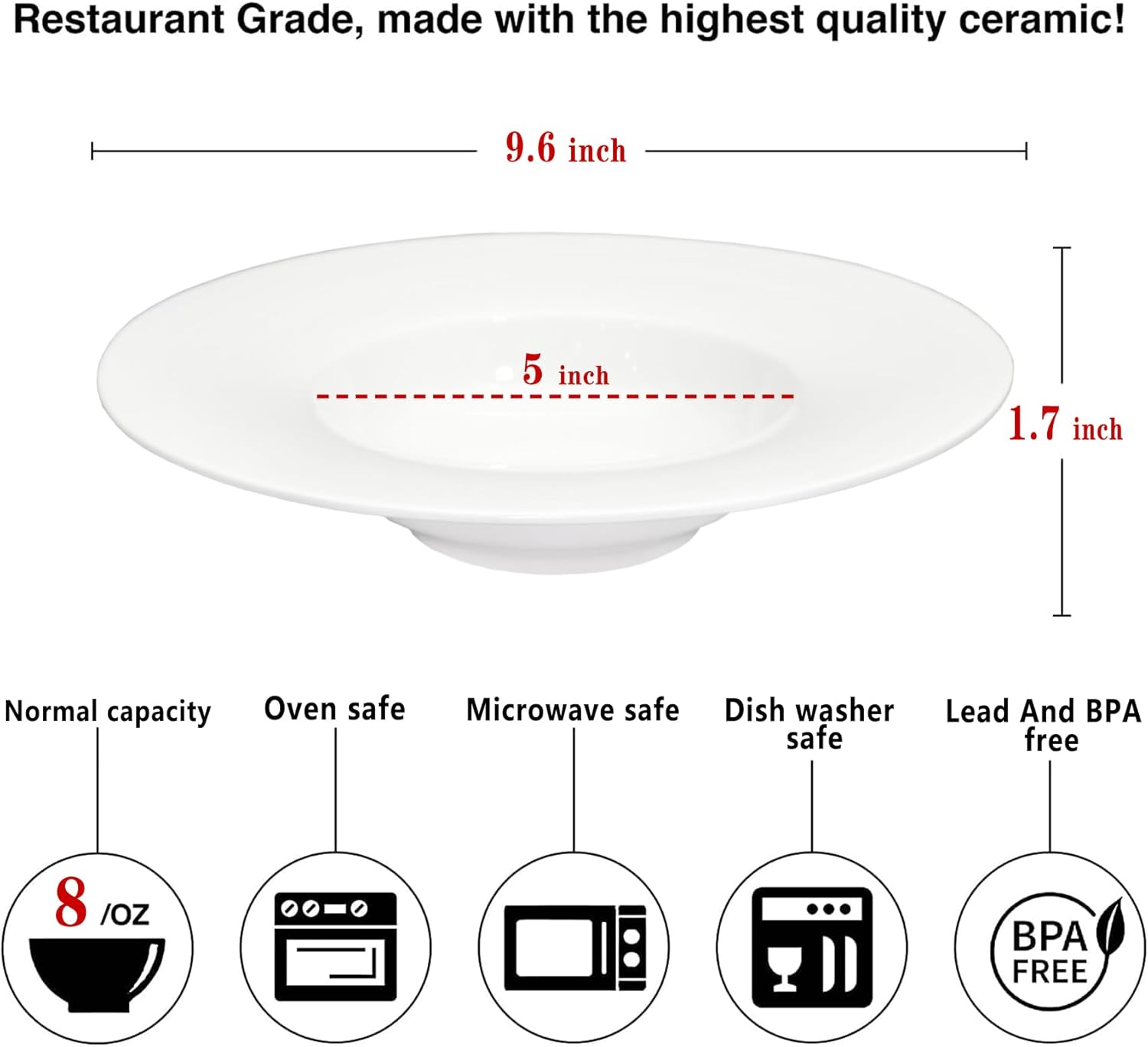 • PERFECT SIZE - Wide Rimmed Soup Bowl 9.6" x 1.7" Inch , Plate Center Bowl Size: 5", Normal Capacity: 8 oz. These soup bowls are a favorite choice for restaurants, hotels, homes and chefs. you can serve hearty portions of soup, pasta, salad, vegetables, cereal, dessert, etc.