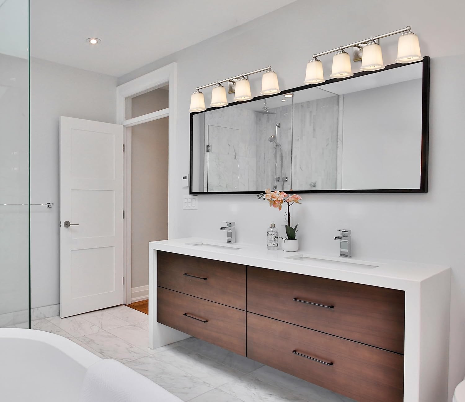 • Design: The brushed nickel finish creates an vintage feel that will match farmhouse decor, while the elegance of the white glass shades makes it perfect for classic and vintage looks as well.