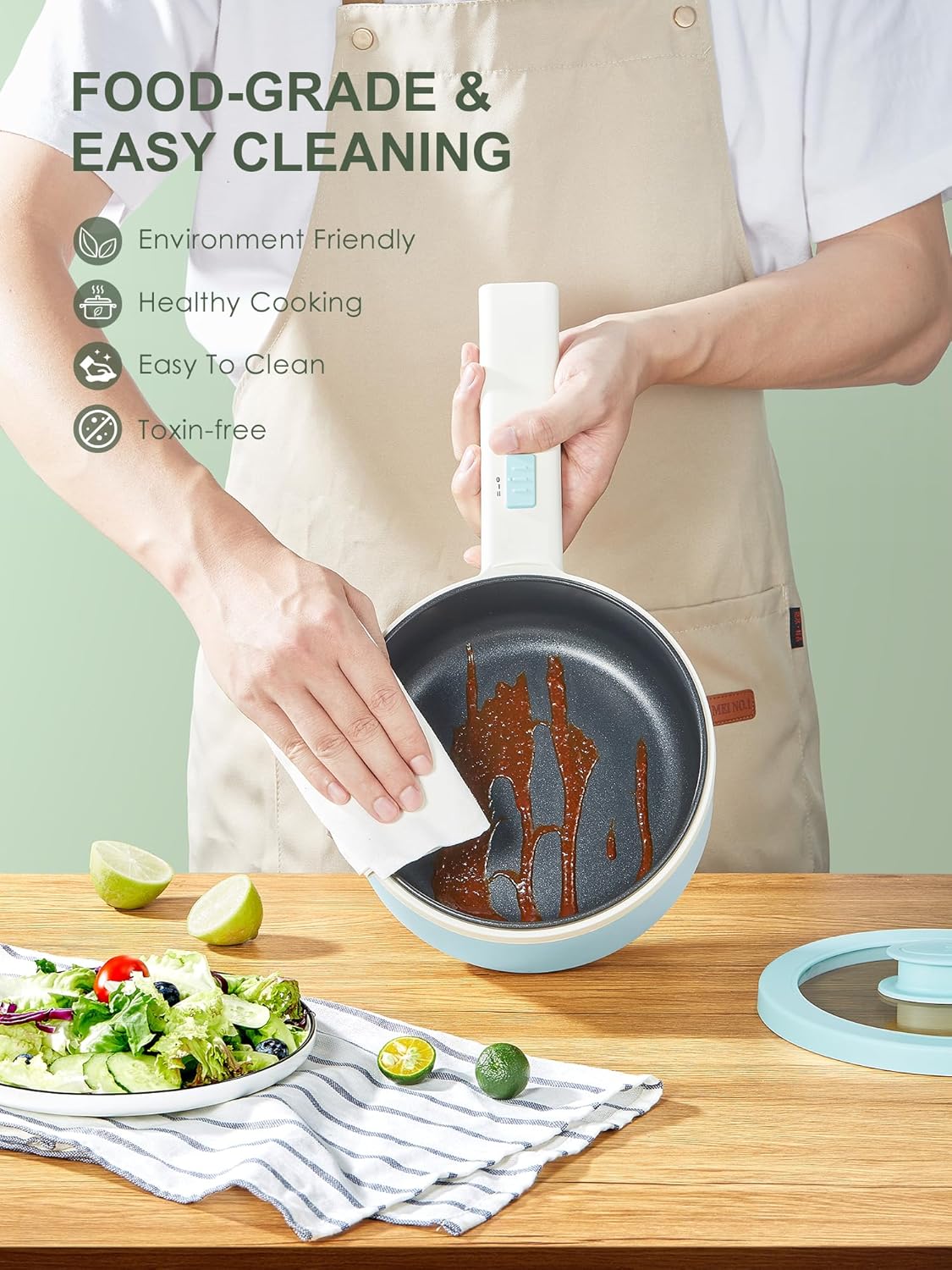 Hot Pot Electric With Steamer, 1.6L Ramen Cooker Non-Stick Sauté Pan for Steak, Egg, Fried Rice, Ramen, Oatmeal, Soup, Portable Personal Perfect Suit Dorm Room and Apartment (Aqua)