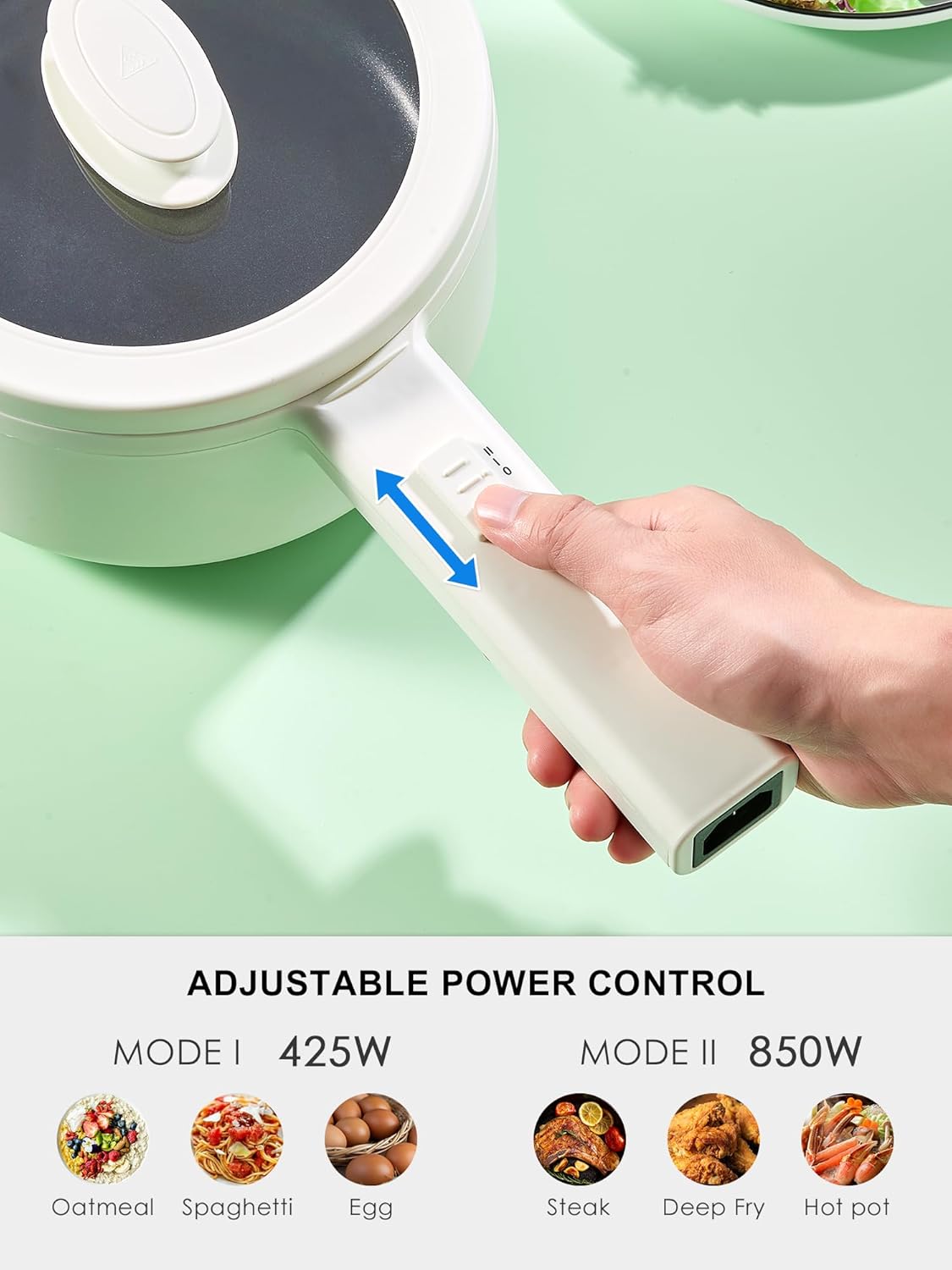 • Adjustable Power Modes: Allowing you to easily control the temperature to satisfy different cooking needs: Low power (425W) for making omelettes, ramen, pancake; High power (850W) for steaming salmon, frenching fries, cooking hot pot, sautéing vegetables and steaks.