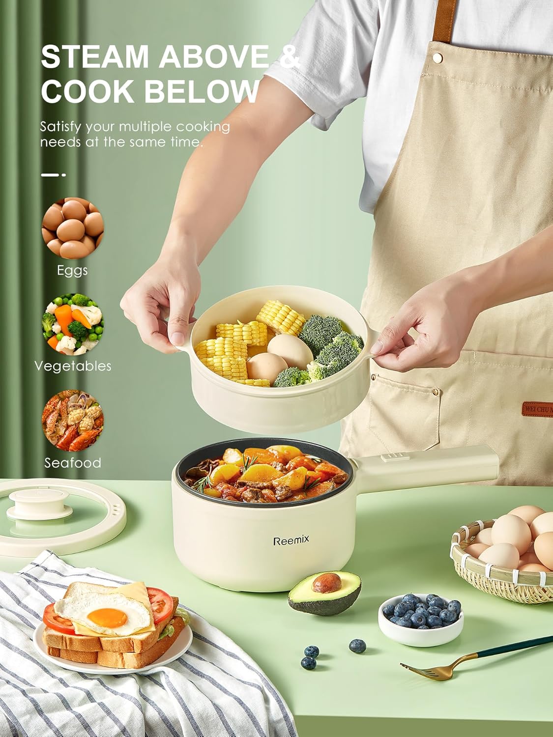 • Fast Heating: Unique 360°annular heating base of Reemix hot pot cooker allows your food to heat up more quickly and evenly on this non-stick surface. Overheat protection & anti-dry function provide you with safer cooking, the mini electric pot will automatically power off when the pot is overheating or at the dry burning status.
