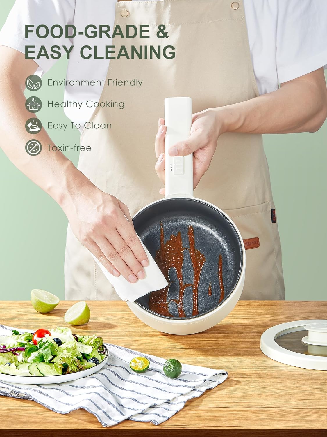 Hot Pot Electric With Steamer, 1.6L Ramen Cooker Non-Stick Sauté Pan for Steak, Egg, Fried Rice, Ramen, Oatmeal, Soup, Portable Personal Perfect Suit Dorm Room and Apartment (White)