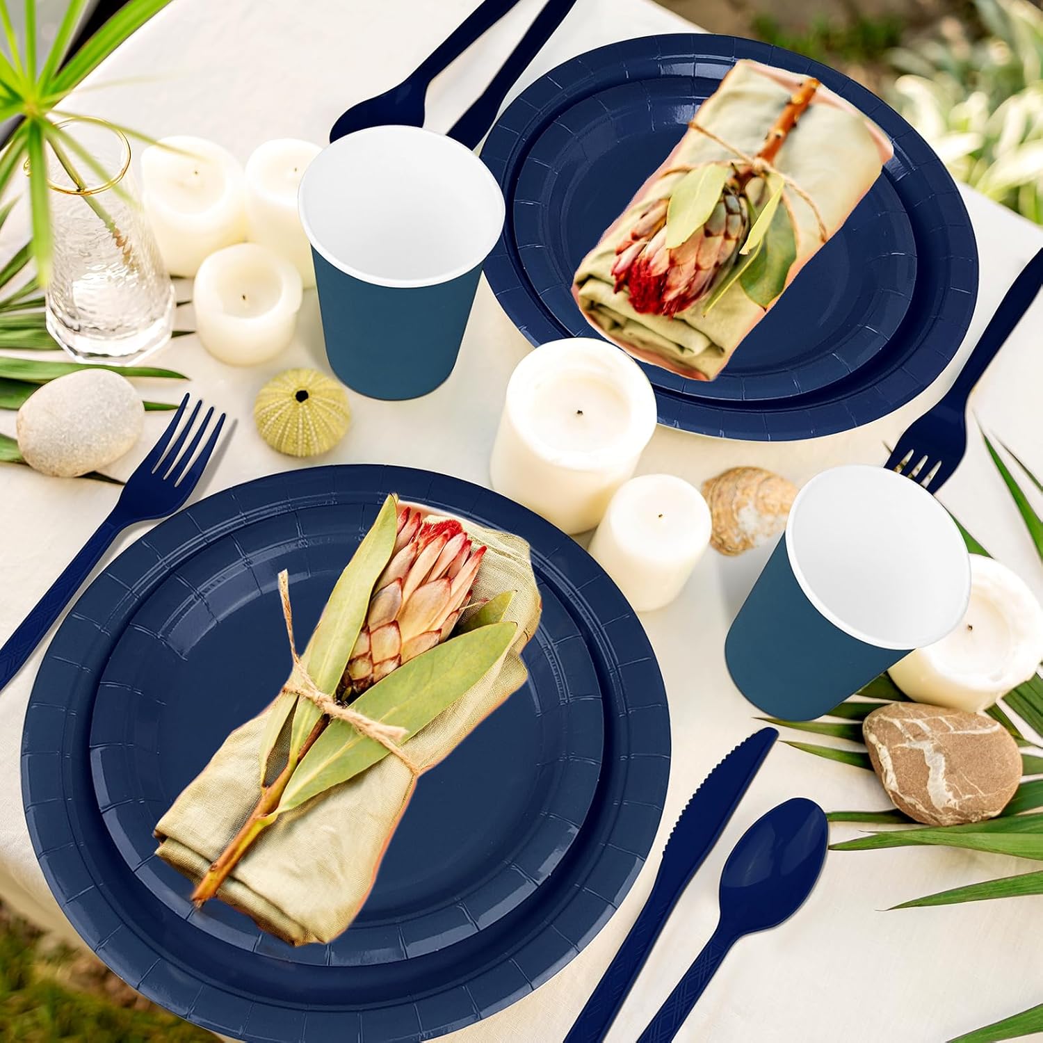 • Navy blue Party Supply Set: The navy blue party supply set with 30 each of 9 inch navy blue paper plate, 7 inch party paper plates, 9 oz paper cups, plastic forks, spoons, knives, and 48 pieces napkins, party plates set ensures table is ready for party