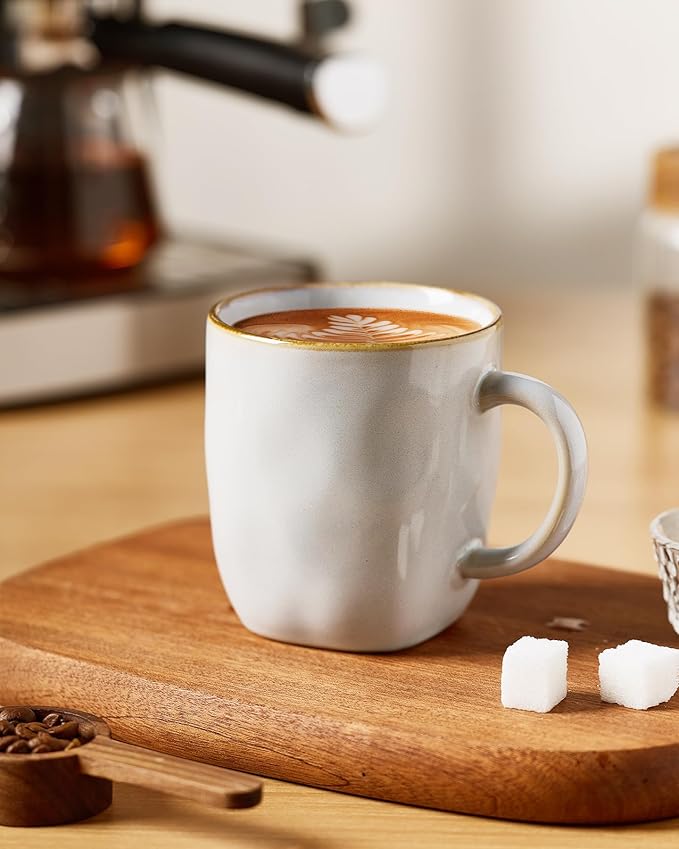 famiware Coffee Mugs Set of 4, Ocean Square 13oz Coffee Cup Set with Handle for Cocoa, Milk, Hot Chocolate, Stoneware Cups for Kitchen, Reactive Glaze, Microwave and Dishwasher Safe, Cappuccino White