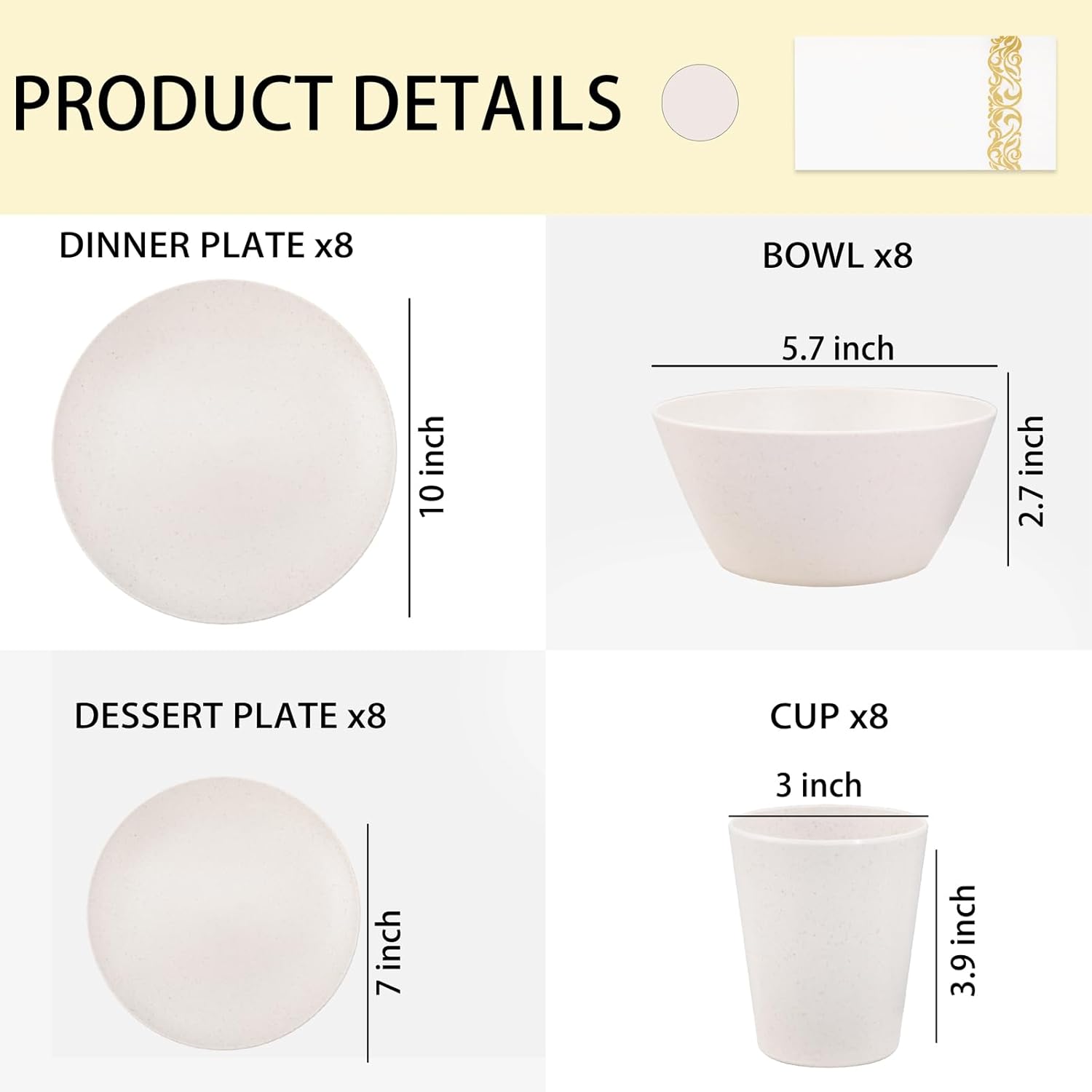 • VALUE PACKAGE INCLUDED:This wheat straw dinnerware sets include 8 dinner plates, 8 salad plates, 8 wheat straw cereal bowls, 8 wheat straw cups and 25pcs linen napkins. the classic beige plastic dinnerware sets are reliable choice for both daily use and special occasions.