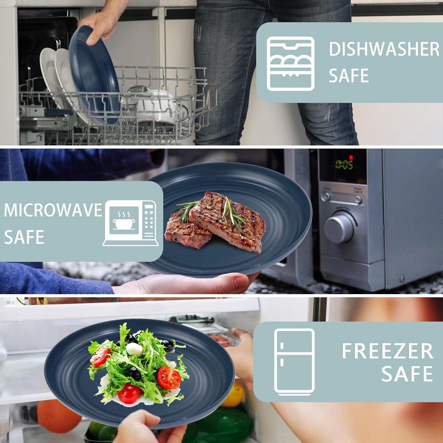 • REUSABLE AND STACKABLE:The wheat straw dinnerware sets is reusable,non-breakable,and designed with space-saving style and smooth round edges, our dark blue dinnerware set are stackable, Stacking keeps your countertop without any mess.