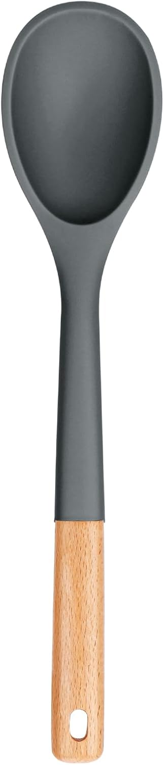 Large Silicone Cooking Spoons, Nonstick Solid Wooden Handle Spoon, Heat Resistan Silicone Kitchen Spoons for Cooking, Serving, Basting, Mixing, 13.2inch (Grey)