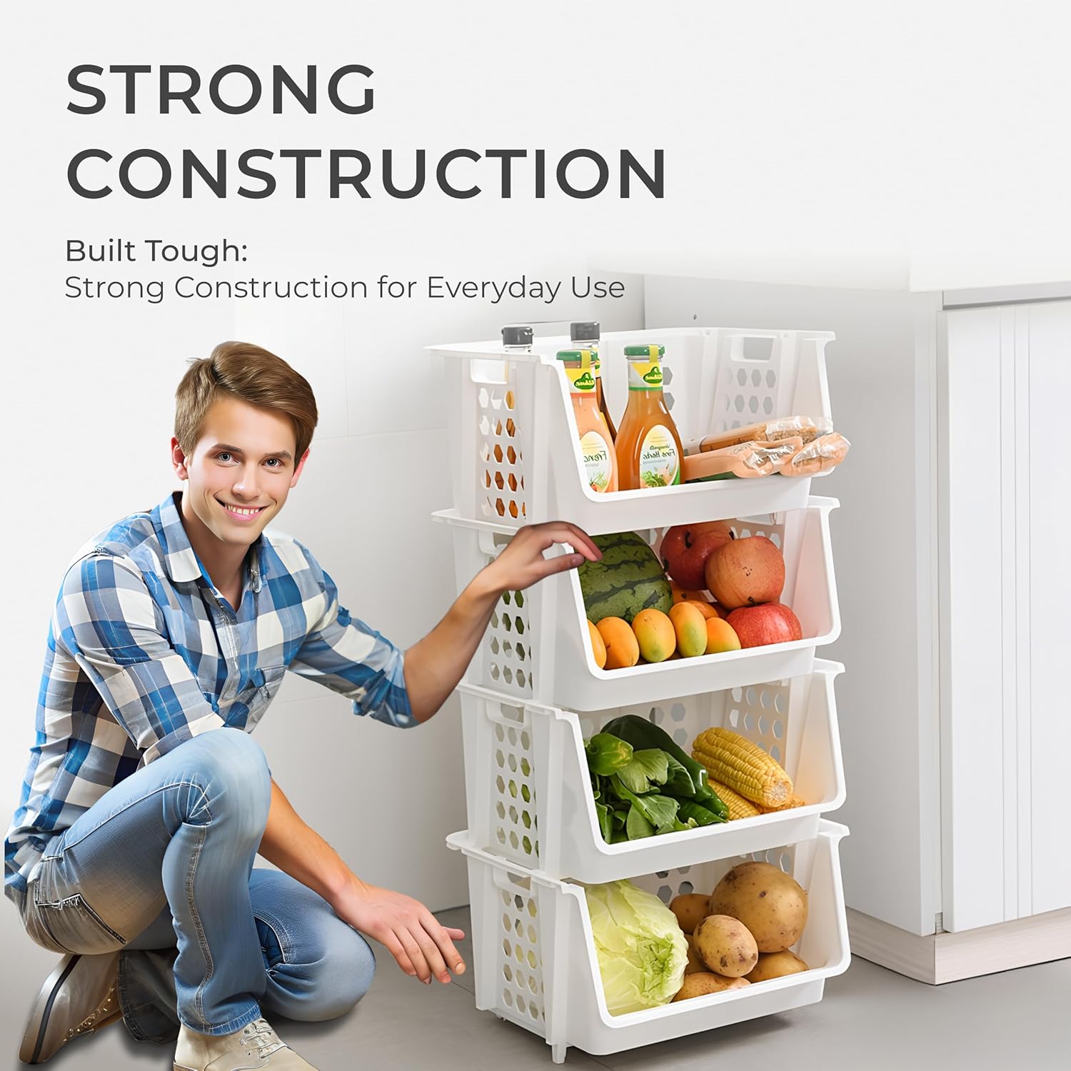 Skywin Plastic Stackable Storage Bins for Pantry - 4-Pack Medium Stackable Bins For Organizing Food, Kitchen, and Bathroom Essentials (White)