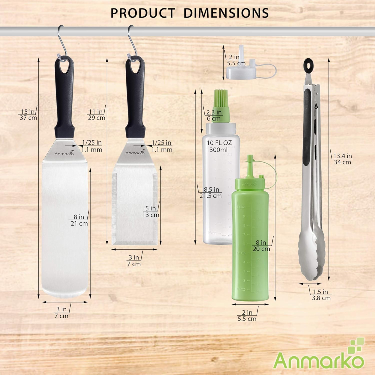 • ✅ PROFESSIONAL STAINLESS STEEL SPATULA SET - includes 1 x cooking spatula turner, 1 x grill spatula, 1 x grill tongs, 2 x squeeze bottles with silicone brush lid.