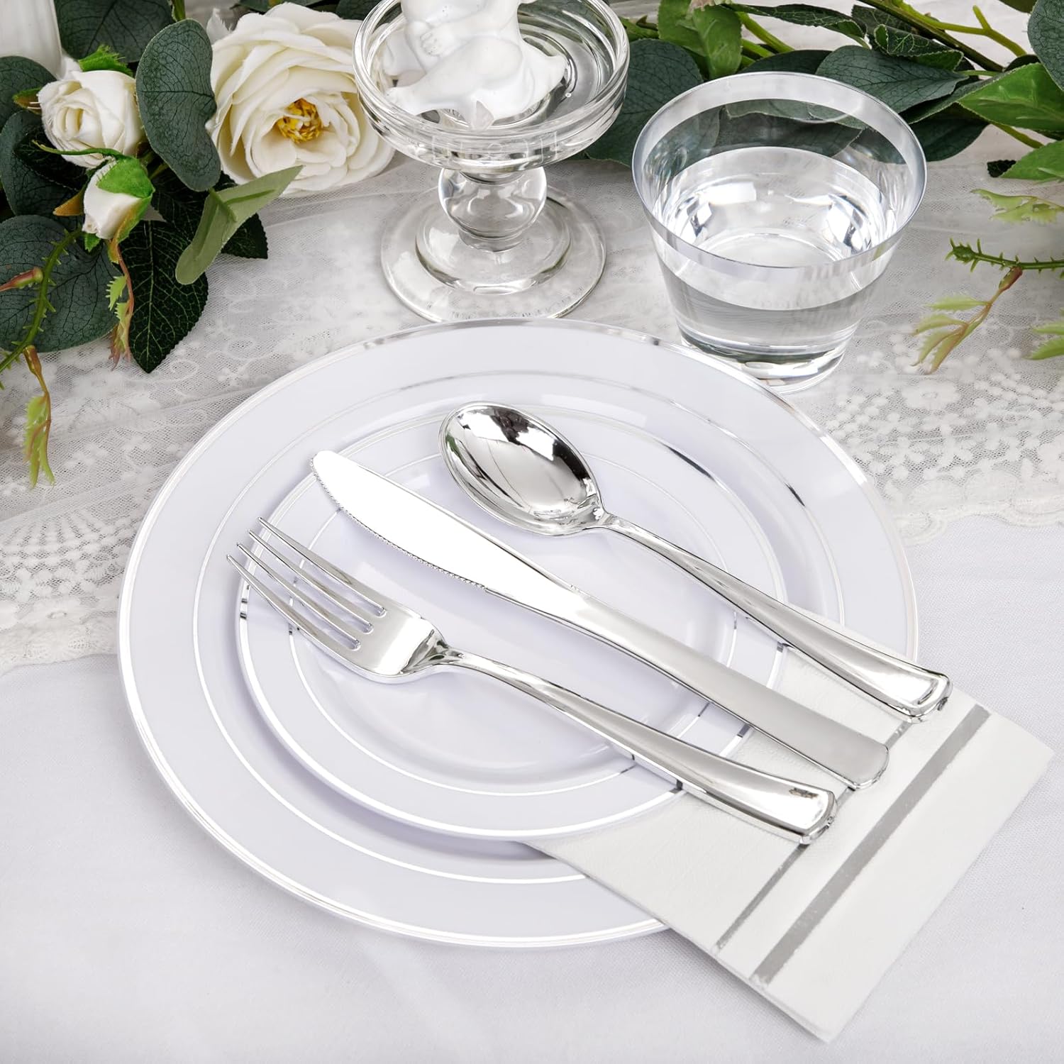 • ELEGANT AND EXQUISITE DESIGN:Our premium silver disposable plates have a unique and exquisite design. The edges of these white plastic plates with silver trim are twice silver plated, elegant and delicate. And these shiny silver plastic cutlery make the party even more glamorous.