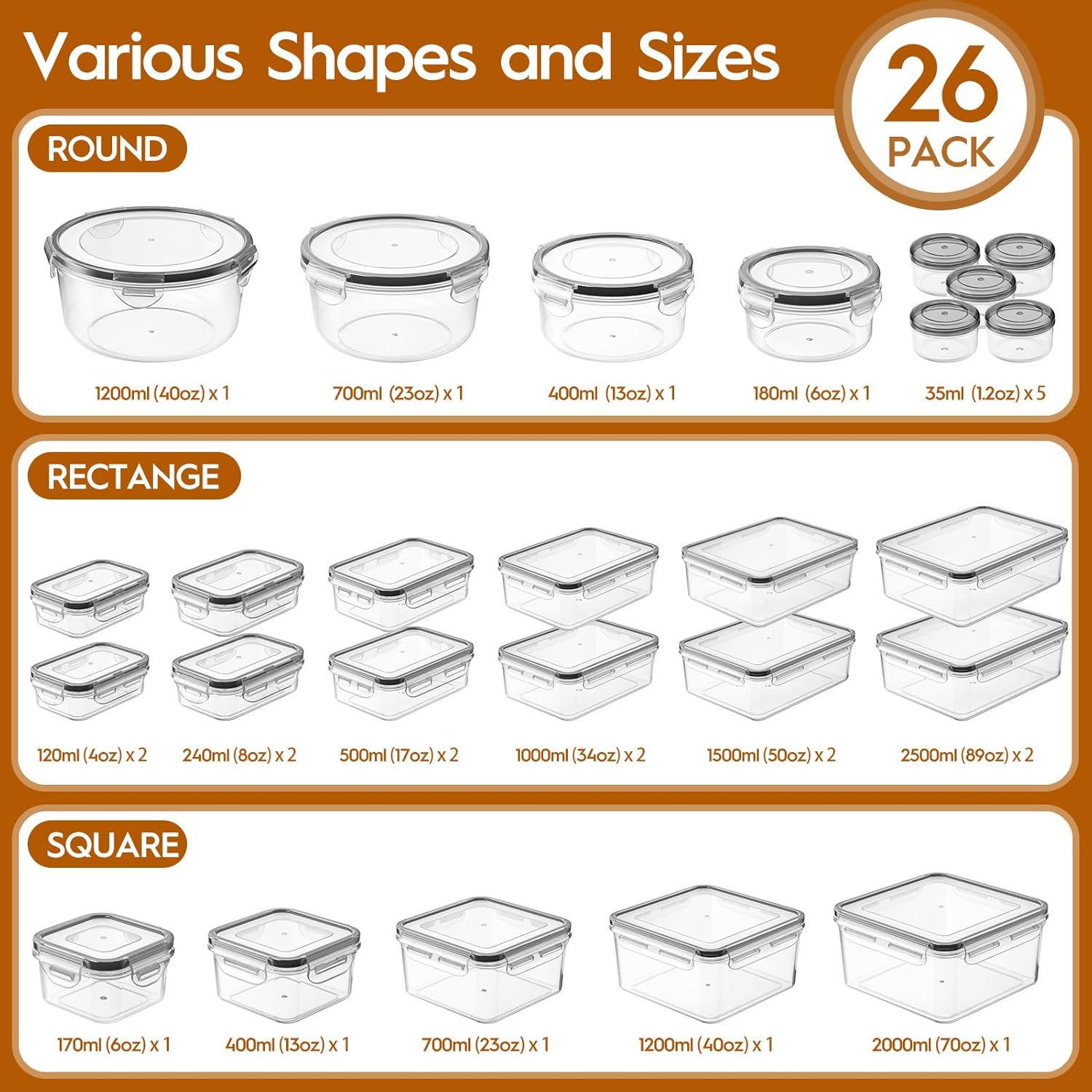 • Perfect Size for All Your Storage Needs: This 50-piece set includes 25 containers and 25 different sized lids from 1.2 to 89 ounces to meet different kitchen storage needs. Rectangular (2*89oz, 2*50oz, 2*34oz, 2*17oz, 2*8oz, 2*4oz); Square (1*70oz, 1*40oz, 1*23oz, 1*13oz, 1*6oz); Round (1*40oz, 1*23oz, 1*13oz, 1*6oz, 5*1.2oz)