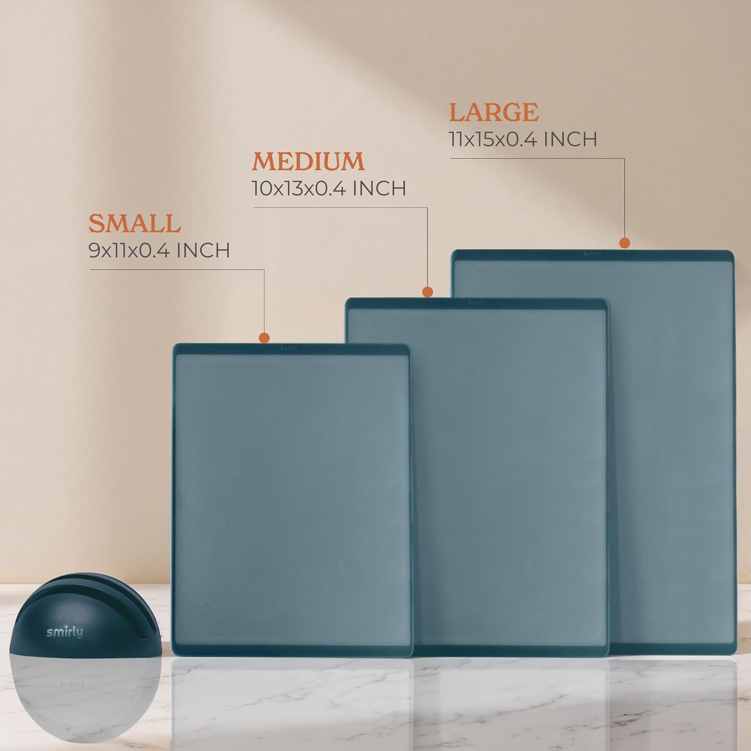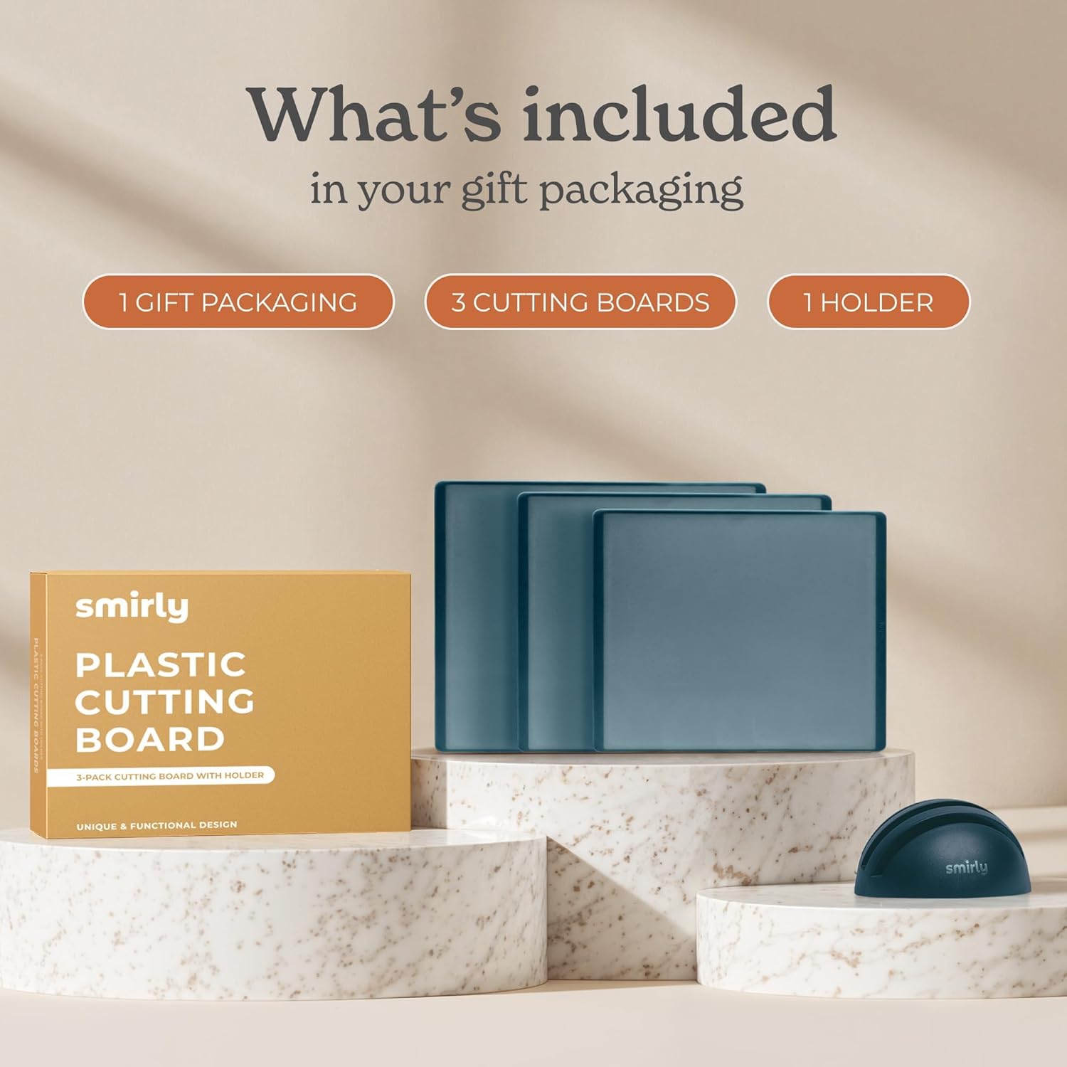 • 3-Pack with Holder: This cutting board set includes small, medium, and large cutting board sizes for every prep need. It also comes with a compact holder that neatly organizes all boards vertically, keeping your countertops clutter-free while ready for any chopping task