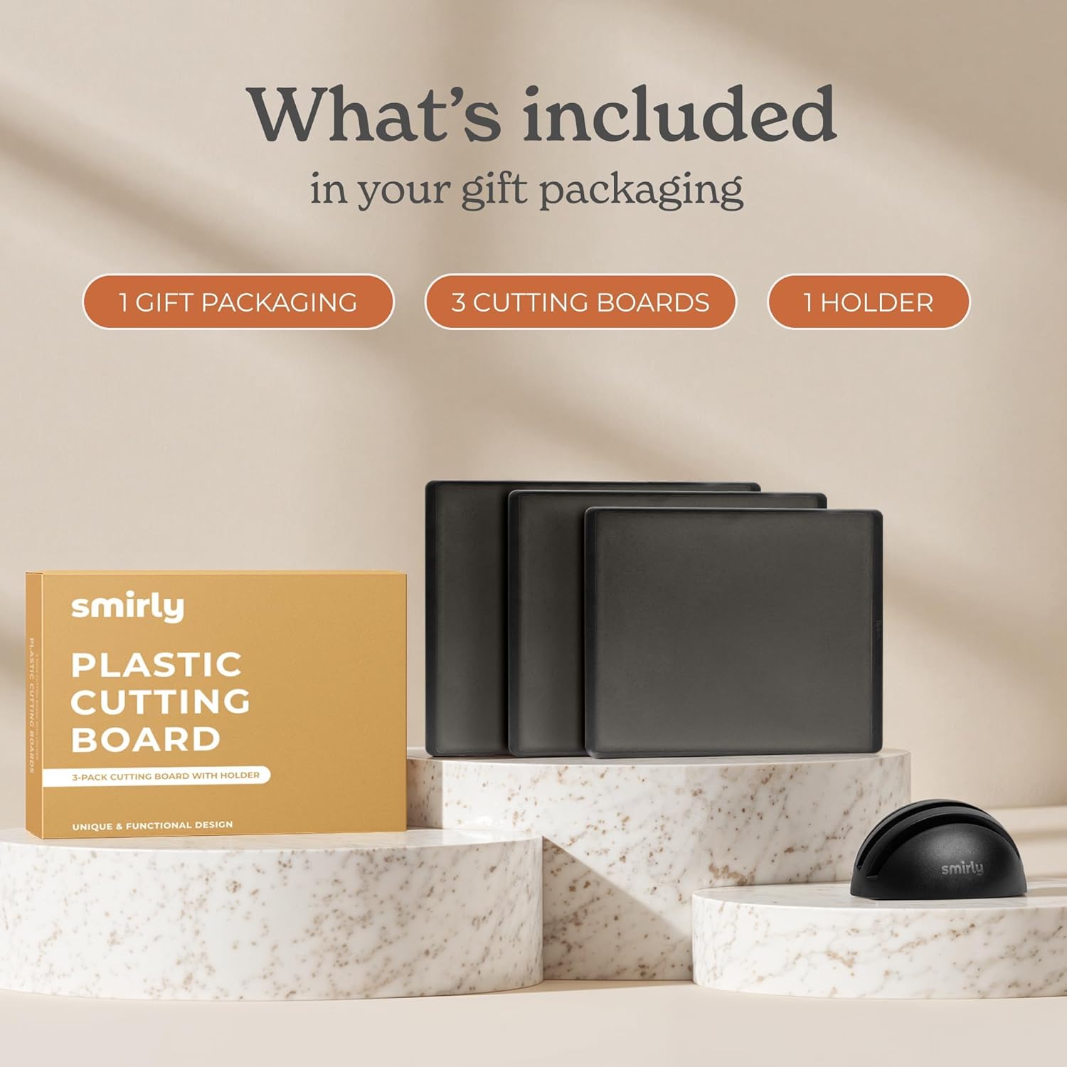 • Included Components : 10" x 13" Plastic Cutting Board, 11" x 15" Inches Plastic Cutting Board, 9" x 11" Plastic Cutting Board, Round Cutting Board Holder 10" x 13" Plastic Cutting Board, 11" x 15" Inches Plastic Cutting Board, 9" x 11" Plastic Cutting Board, Round Cutting Board Holder