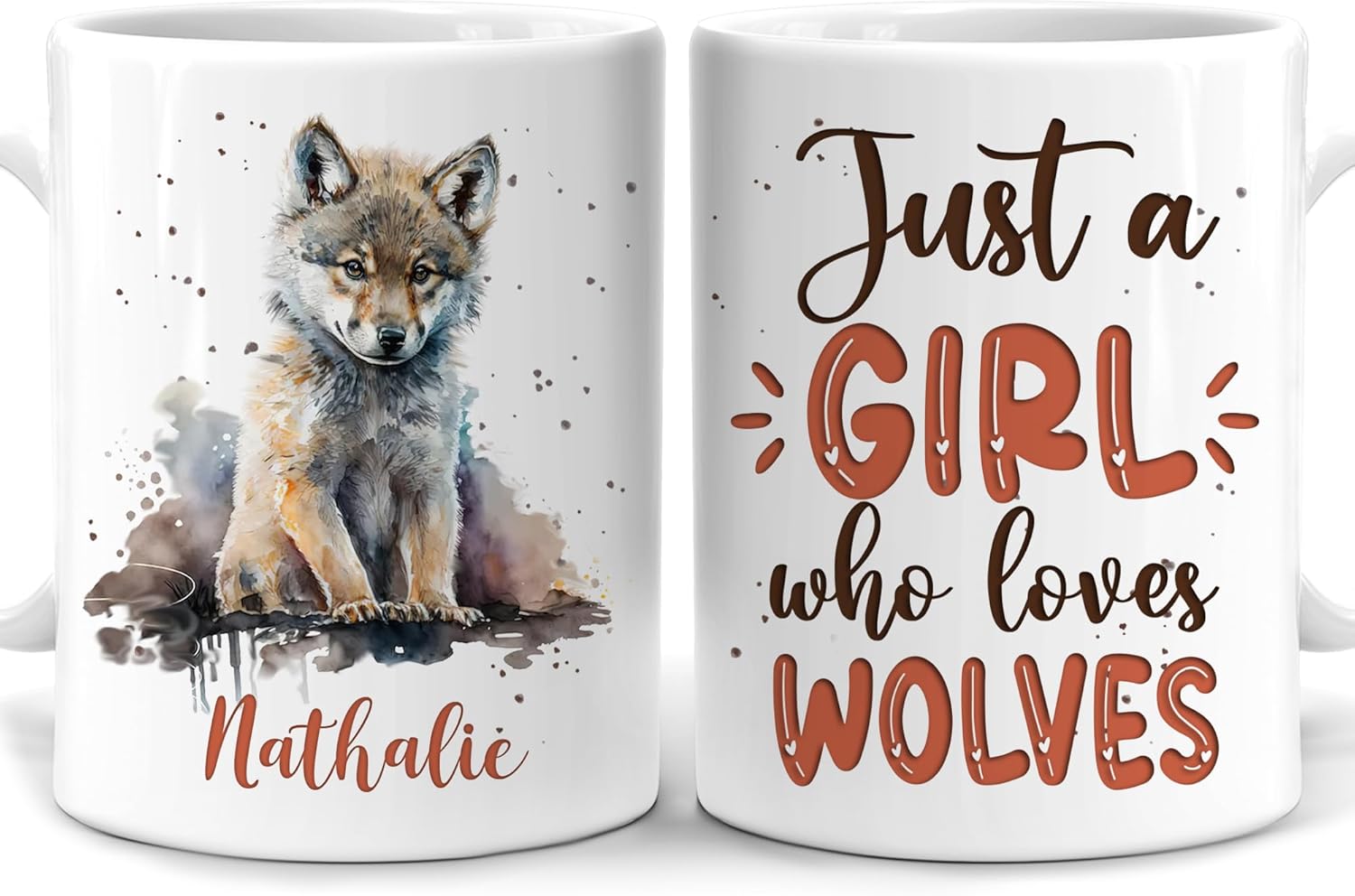 Hyturtle Personalized Gifts Wolf Lover - Just A Girl Who Loves Wolves Custom Name Ceramic Coffee Mug Cup 11oz - Idea Cute Animal Lover Gifts For Women, Girl Daughter On Birthday, Christmas