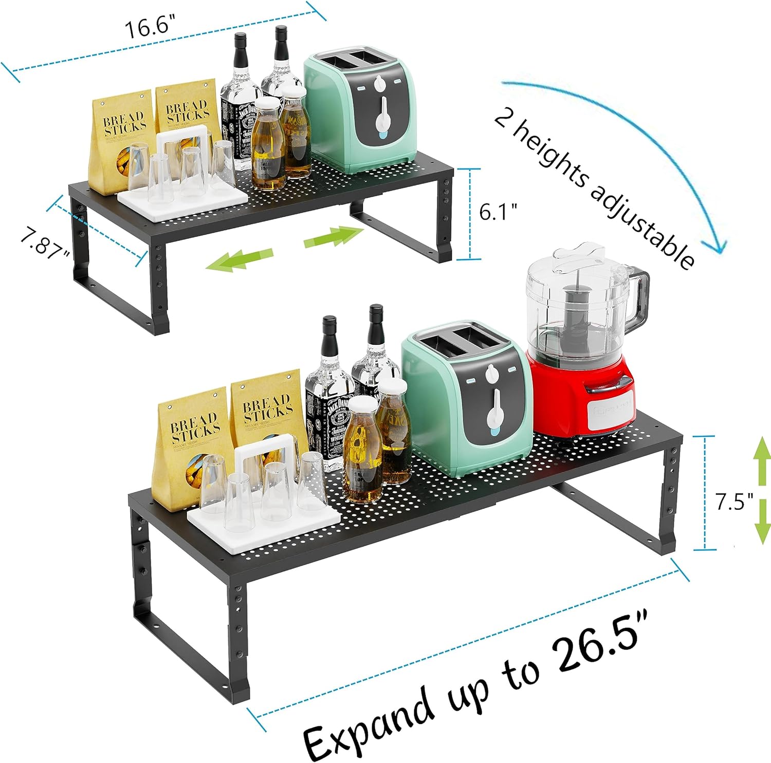 • ⭐【Expandable & Stackable Cabinet Organizer】: The length and height of this kitchen counter shelf organizer can be adjusted to your desire. The original countertop shelf measures 16.54~26.38" L x 7.87/9.84" W x 6.2~7.48" H. The length can vary from 16.54 inches to 26.38 inches in length depending on how you want to arrange your space. It also can be easily stacked to a 2 tire spice shelf, or used separately as 2 single shelves.