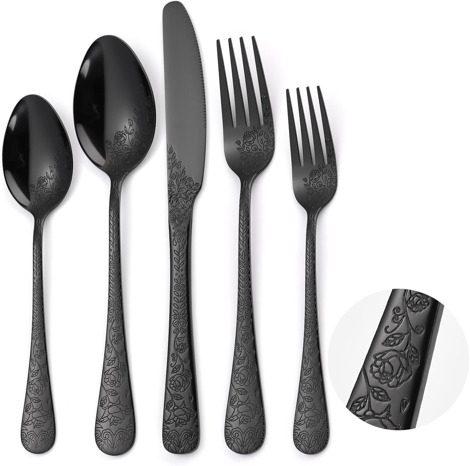 • VERSATILE USE SUITABLE FOR CASUAL AND FORMAL OCCASIONS Black Cutlery Set elevate your dining experience with our elegant retro black flora silverware set for 6. Designed for both casual gatherings and formal occasions, this versatile set adds a touch of sophistication to any table setting with its beautiful floral design and sleek black finish.levate your dining experience with this set of 30 vintage floral silverware in classic black. Whether it's a special occasion or a casual meal, this elegant set is sure to impress