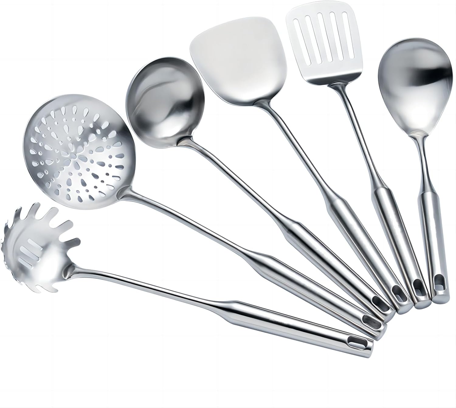 Cooking Utensils Set Stainless Steel Kitchen Metal Serving Utensils Set of 6 Pcs-Wok Spatula Ladle Set, Slotted Skimmer, Pasta Server, Serving Spoon, Slotted Spatula Tunner,Dishwasher Safe