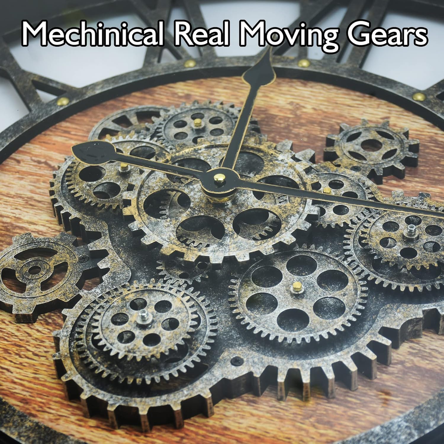• 🧭【Unique Design, Only For Your Home】 Round solid Wood frame and classic retro skeleton with real mechanical moving gears in the central, the wooden frame is handcraft, showing unique attractive wood grain color and small natural knots; artificial rust-imitated treatment marks on the skeleton for vintage and industrial effect; stronger tempered glass resists any breakage and keeps safety whenever; The design is very different from other clocks, just to break the ordinary, only for your home.