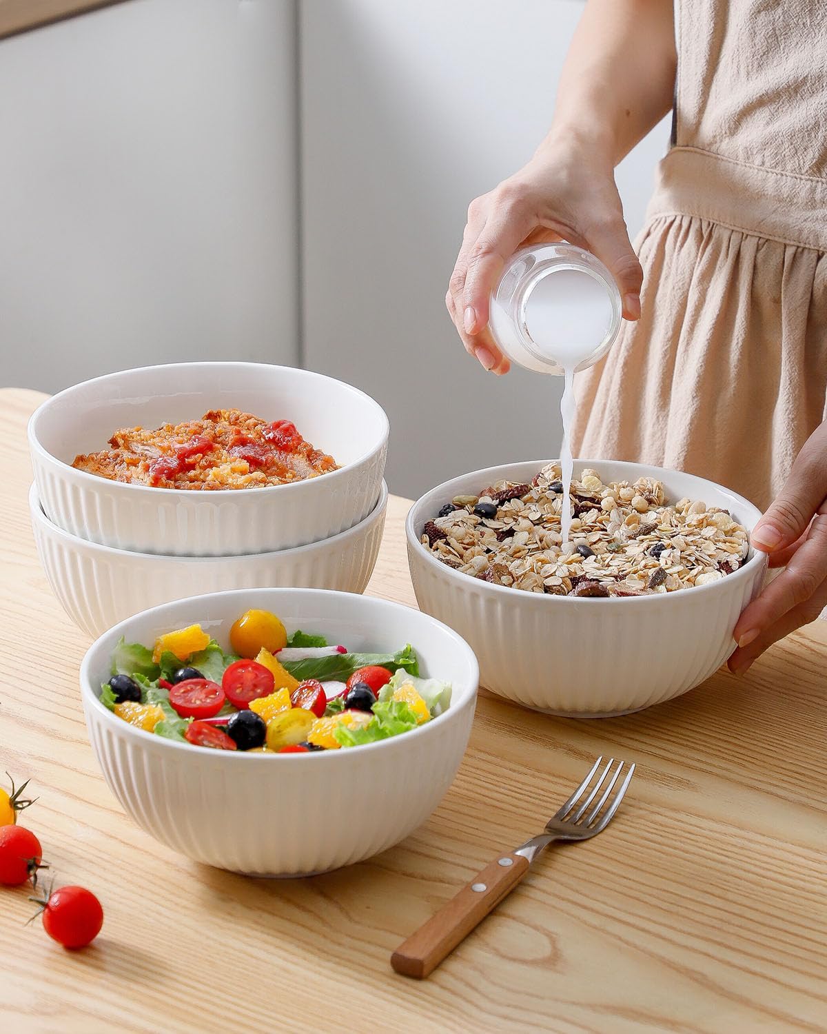Hasense Large Serving Bowls 7 Inch - 42 Oz White Ceramic Salad Bowl Set of 4 for Kitchen,Modern Ribbed Porcelain Dishes for Entertaining,Soup,Pho,Pasta,Cereal, Noodle - Dishwasher & Microwave Safe