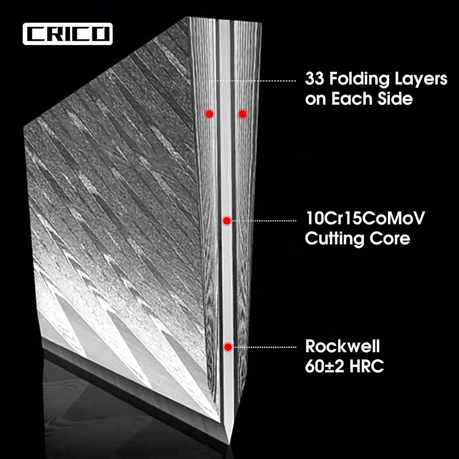 • 【VG-10 67-LAYERS DAMASCUS STEEL】 CRICO chef's knife is made from professional forged 67-layers VG-10 Damascus high-carbon stainless steel. Hardness reaches Rockwell 60±2 HRC while still maintain excellent toughness, machinability, and corrosion resistance.