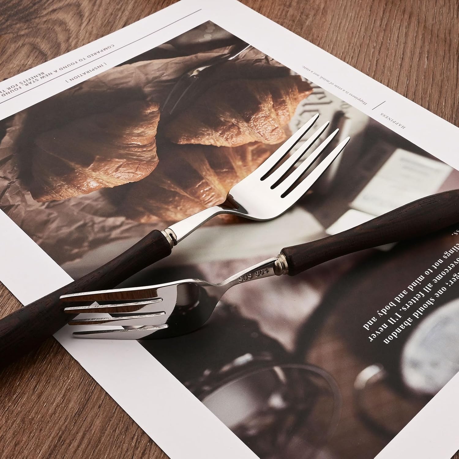• [EXCELLENT MATERIAL] - This flatware set are made of high quality 18/8 (304) stainless steel and soild wood handle which is very durable, rust-proof, corrosion resistant and will not produce residues or odors like other materials. So go ahead and set a table for a formal dining experience or dine alfresco. Our wood silverware set is exactly what you need!