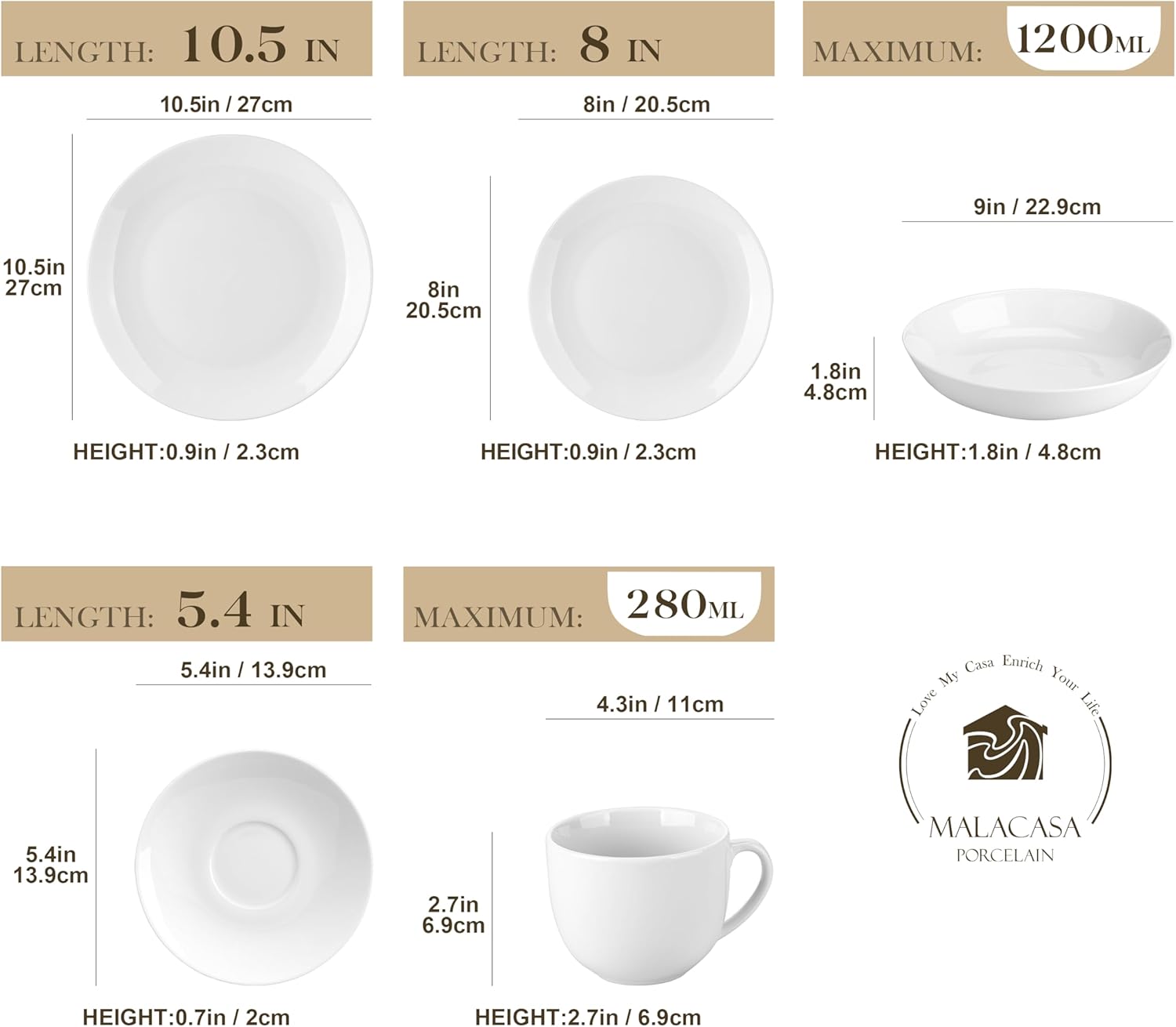 • 【WHAT'S IN THE BOX】MALACASA 30-Piece Porcelain Dinnerware Sets for 6 - Includes 10.5'' Dinner Plates, 8'' Dessert Plates, 40 oz Soup Plates and 9 oz Coffee Mugs and 5.4'' Saucers.