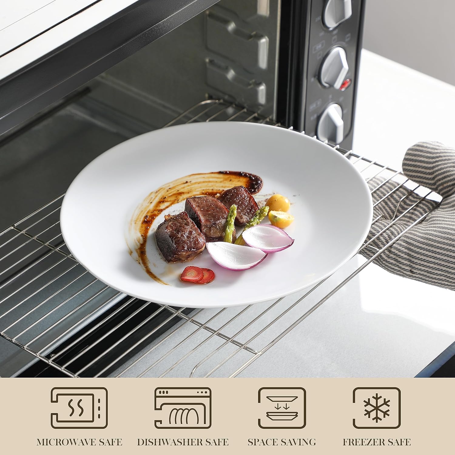 • 【UPGRADED QUALITY & KEEP HEALTHY】A type of premium LEAD-FREE, CADMIUM FREE and NON- TOXIC ceramic which are anti-chip, scratch resistant, bright surface, easy to clean and maintain, longer service life. Gourmet Porcelain is fired at high temperatures, which gives it greater hardness and durability. It can withstand high temperatures without easily cracking or deforming.