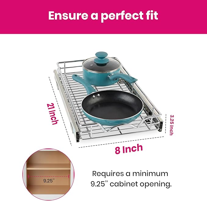 • EASY TO INSTALL & HARDWARE INCLUDED: Our pull out cabinet organizer dimensions measure 8”W x 21”D x 3.15” and includes simple step-by-step instructions along with all of the hardware necessary for easy installation. Installs with just a few simple screws, and Fits cabinet openings 9-1/4”and larger