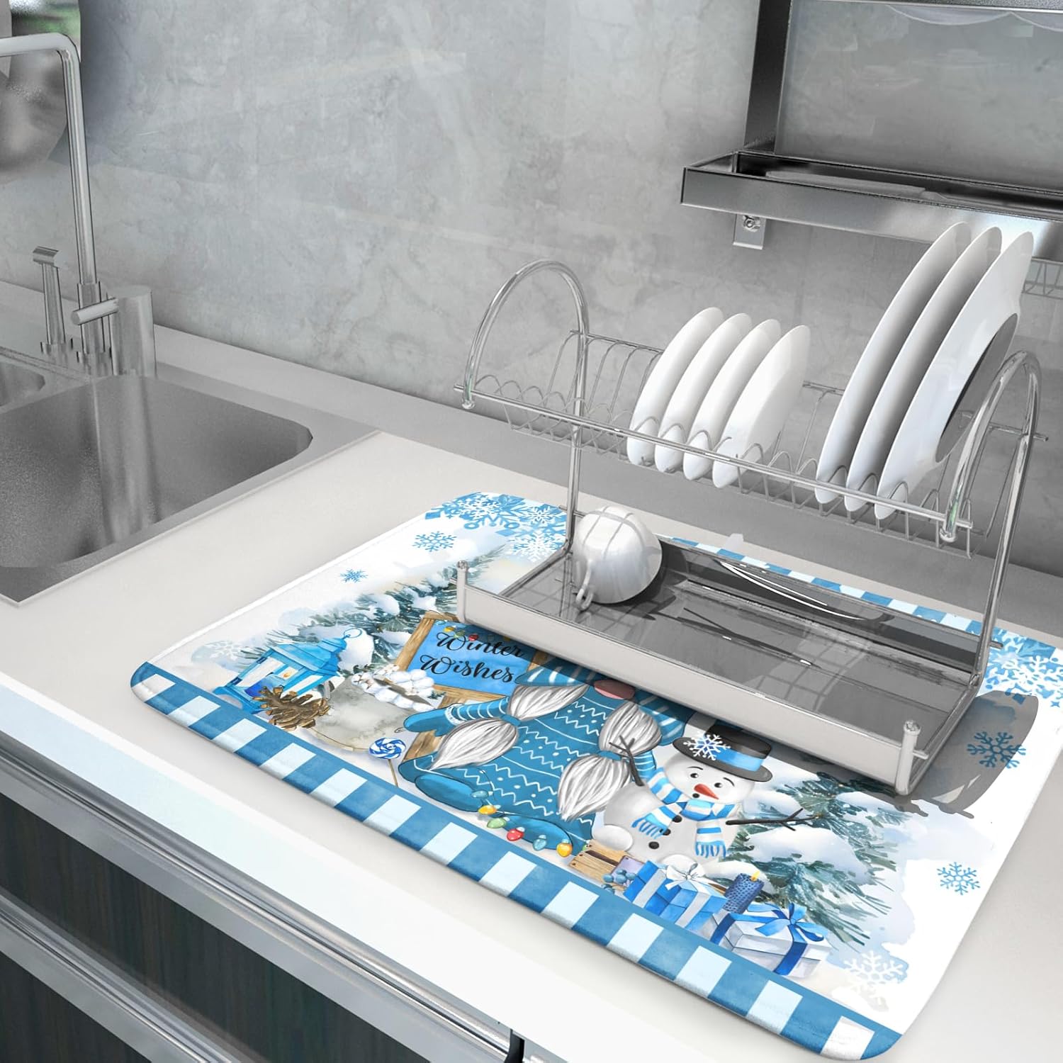Winter Gnome Dish Drying Mat for Kitchen Counter Christmas Tree Snowman Snowflake Dish Drainer Farmhouse Dish Drainer Rack Mats Pad Heat Resistant Foldable Absorbent, 24x18 Inch