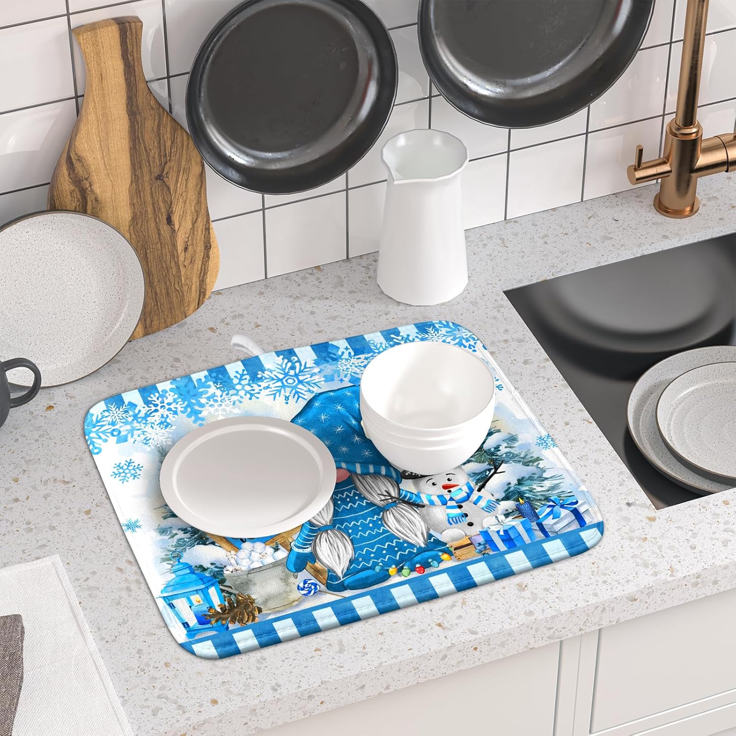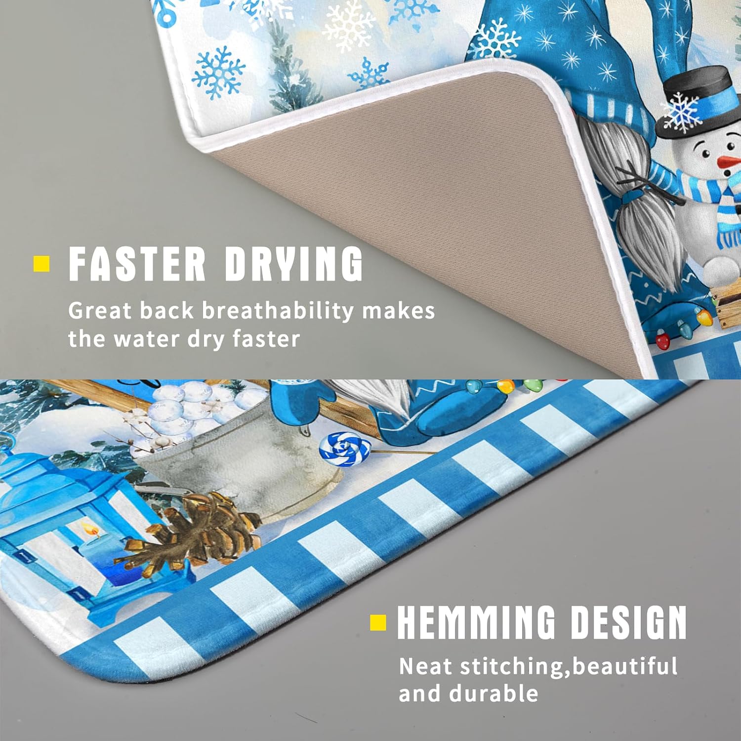 Winter Christmas Gnomes Dish Drying Mat 16x18 for Kitchen Counter Snowman Xmas Gift Tree Snowflake Large Absorbent Microfiber Fast Dry Dishes Draining Mats Holiday Kitchen Decor