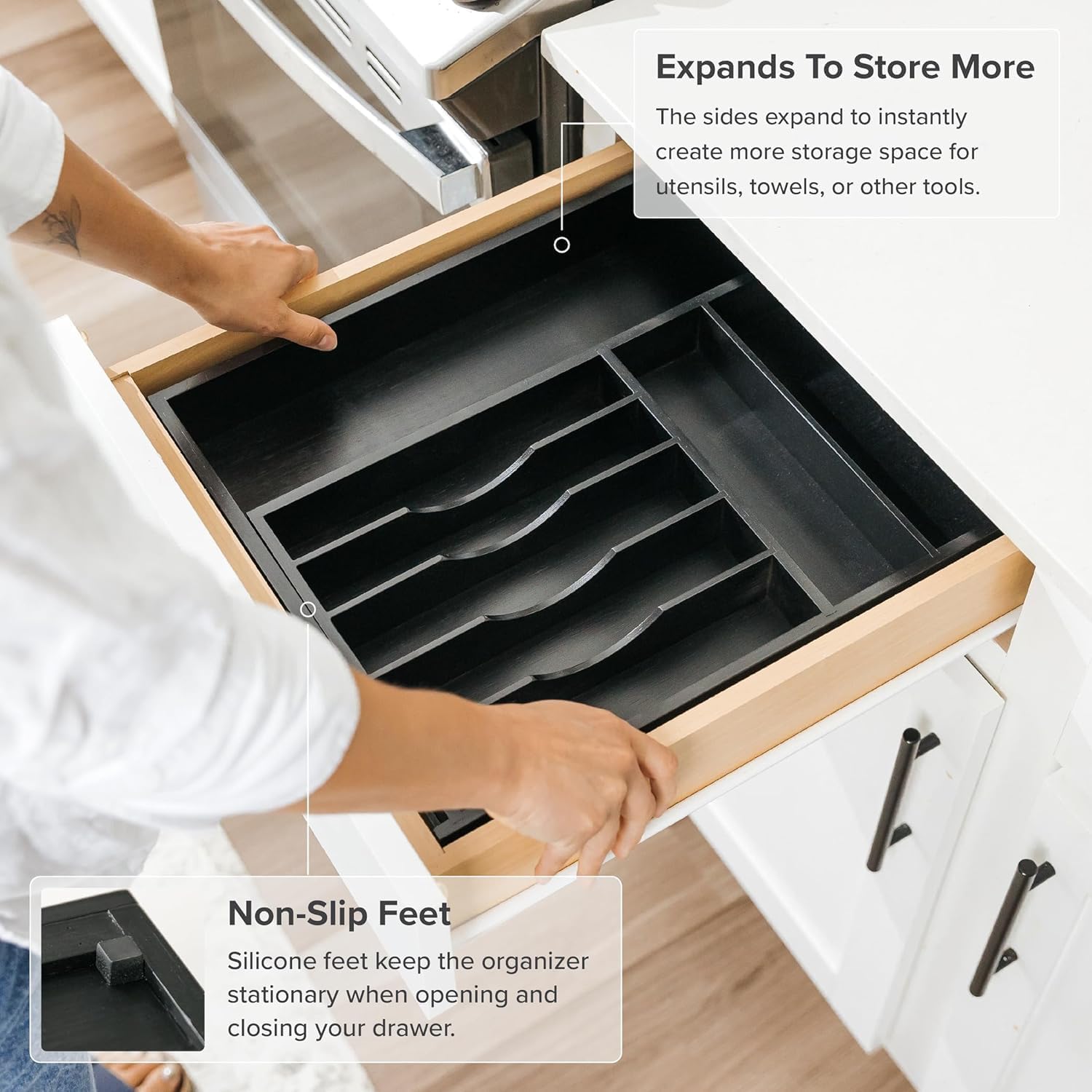KitchenEdge Premium Silverware, Flatware and Utensil Organizer for Kitchen Drawers, Food-Safe Contract Grade, Expandable from 10.5 to 19 In, Black Bamboo