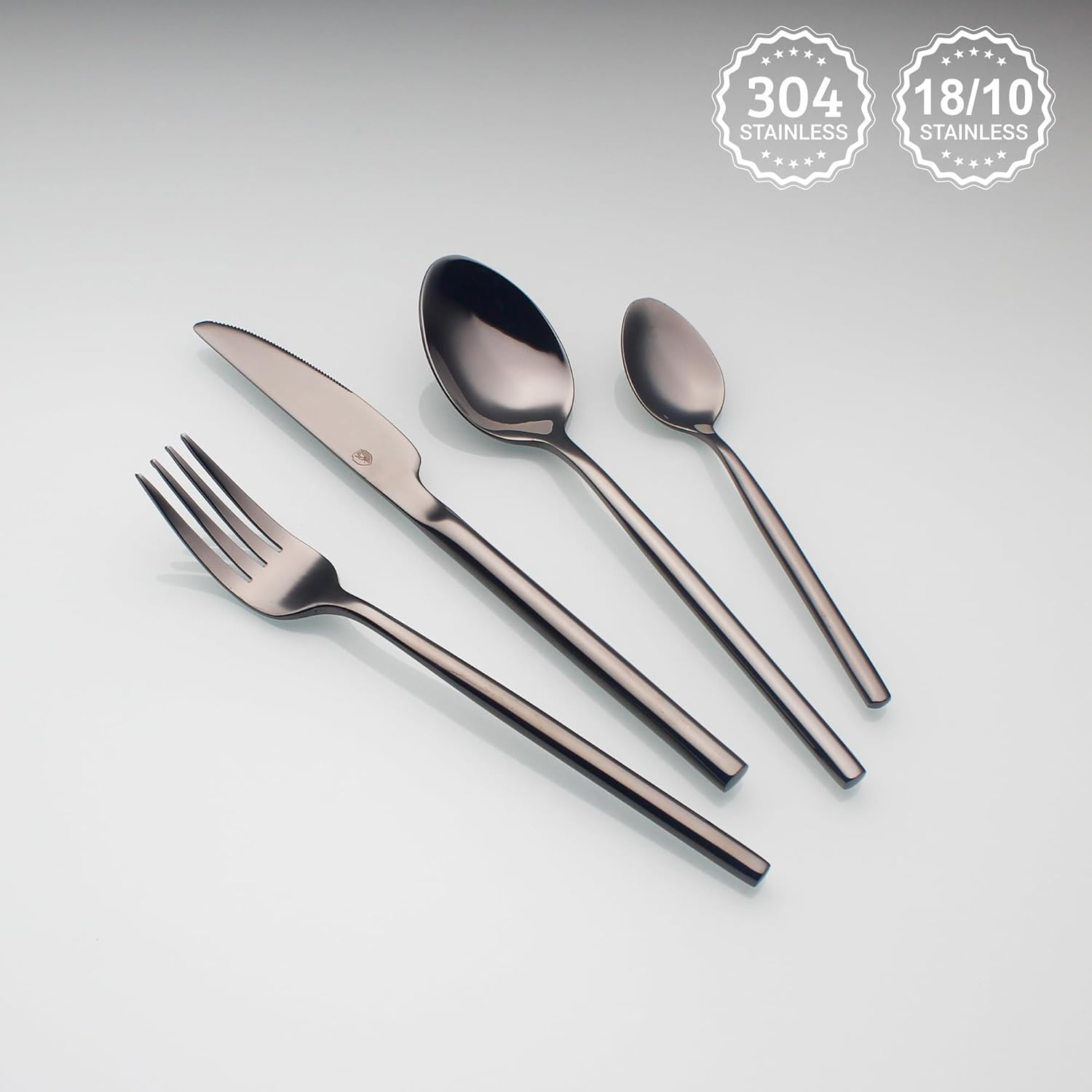 • Sleek & Elegant design utensil sets: Simlar to Gunmetal Gray.Luxury modern round handle shape highly mirror polished finished fine & natural.Surface without grain smooth and sleek easy for clean. Thick and solid weighted well balanced,it’s a pleasure to grip that upgrade your dining experience.