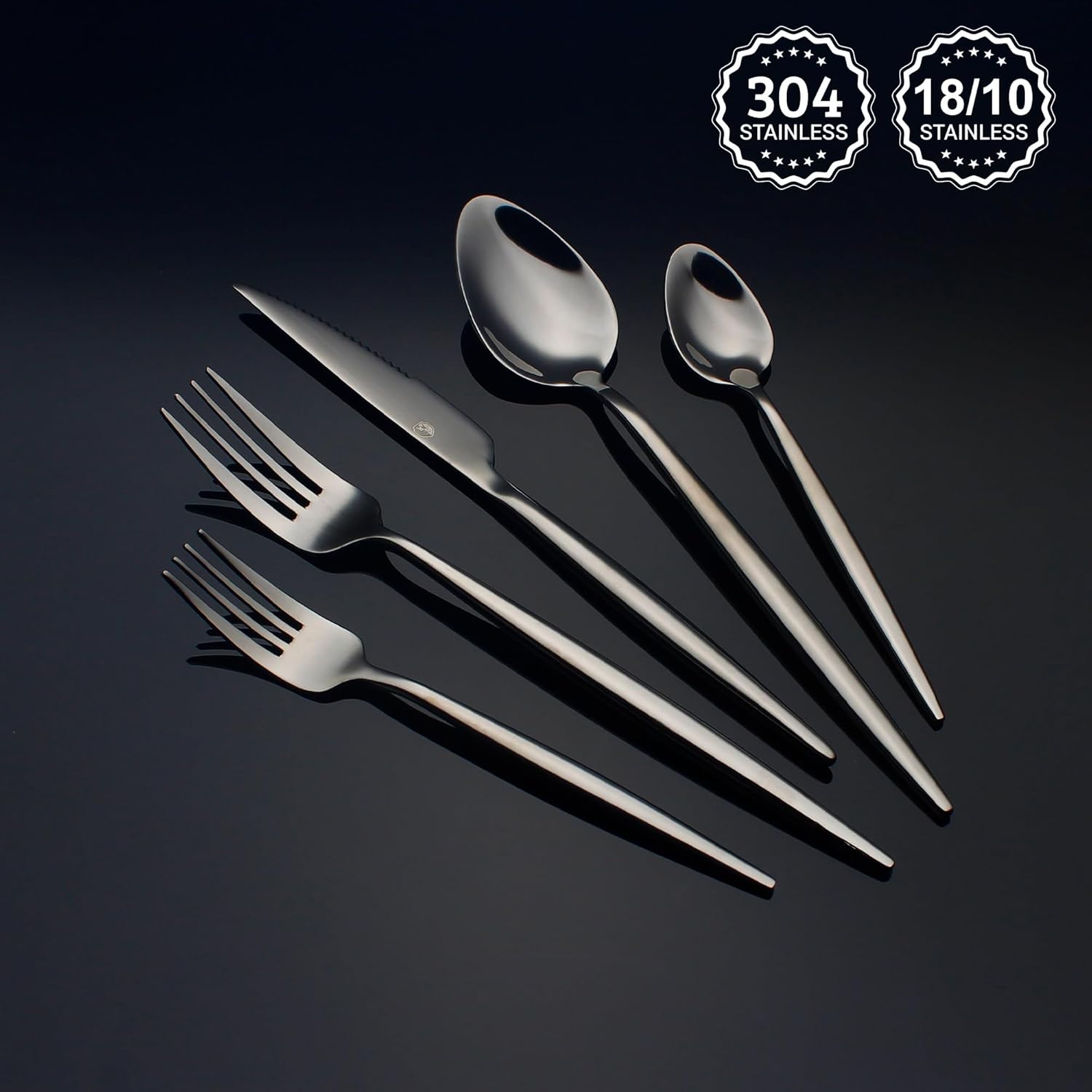 • Elegant modern design silverware: Similar to Gunmetal Gray.Solid thick round & squared shape smooth handle surface that offers a sleek and comfortable grip. Each piece of tableware is a pleasure to hold, with well-balanced weight that enhances the dining experience,you can't put it down.