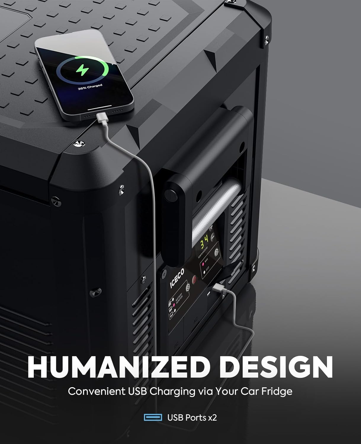 • [Convenient Plugs] 12/24V DC ports are installed on both sides of the fridge. 2 USB outlets designed for charging mobile devices (Only available under DC Power). Built-in AC transformer allows you to pre-cool the fridge from your home socket 110-240V. Built-in AC transformer allows you to pre-cool the fridge from your home socket 110-240V.
