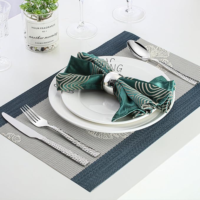 • 【Hammered Silverware Set】Includes 12 dinner forks, 12 salad forks, 12 dinner knives, 12 dinner spoons, and 12 teaspoons, perfect for the home, kitchen, restaurant, or party. This cutlery set will also help you add a sense of design to your dinner at a party.