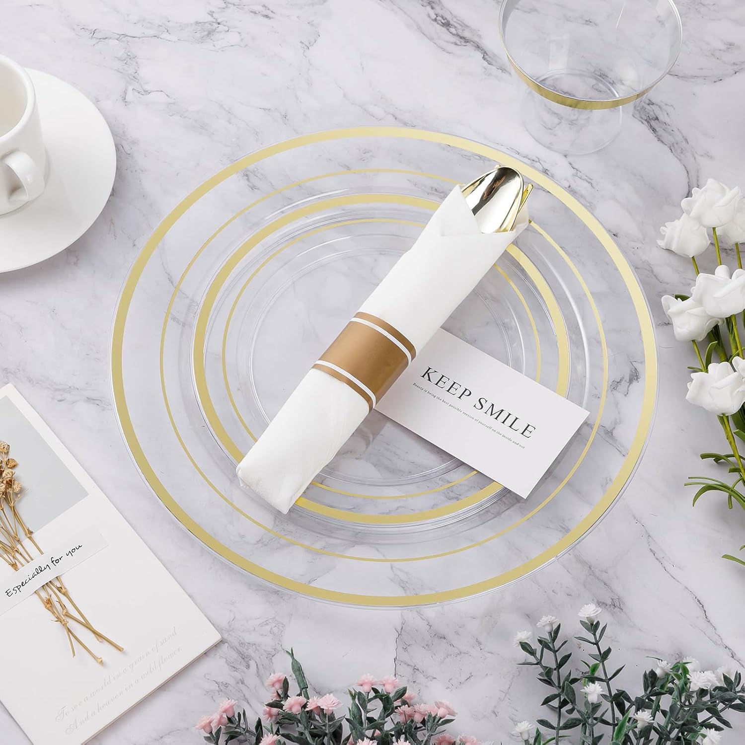 BESTVIP 175PCS Clear Gold Plastic Dinnerware Set, Disposable Party Plates for 25 Guests, Include: 50 Plastic Plates, 25 Pre Rolled Napkins with Silverware, 25 Cups for Christmas, Halloween
