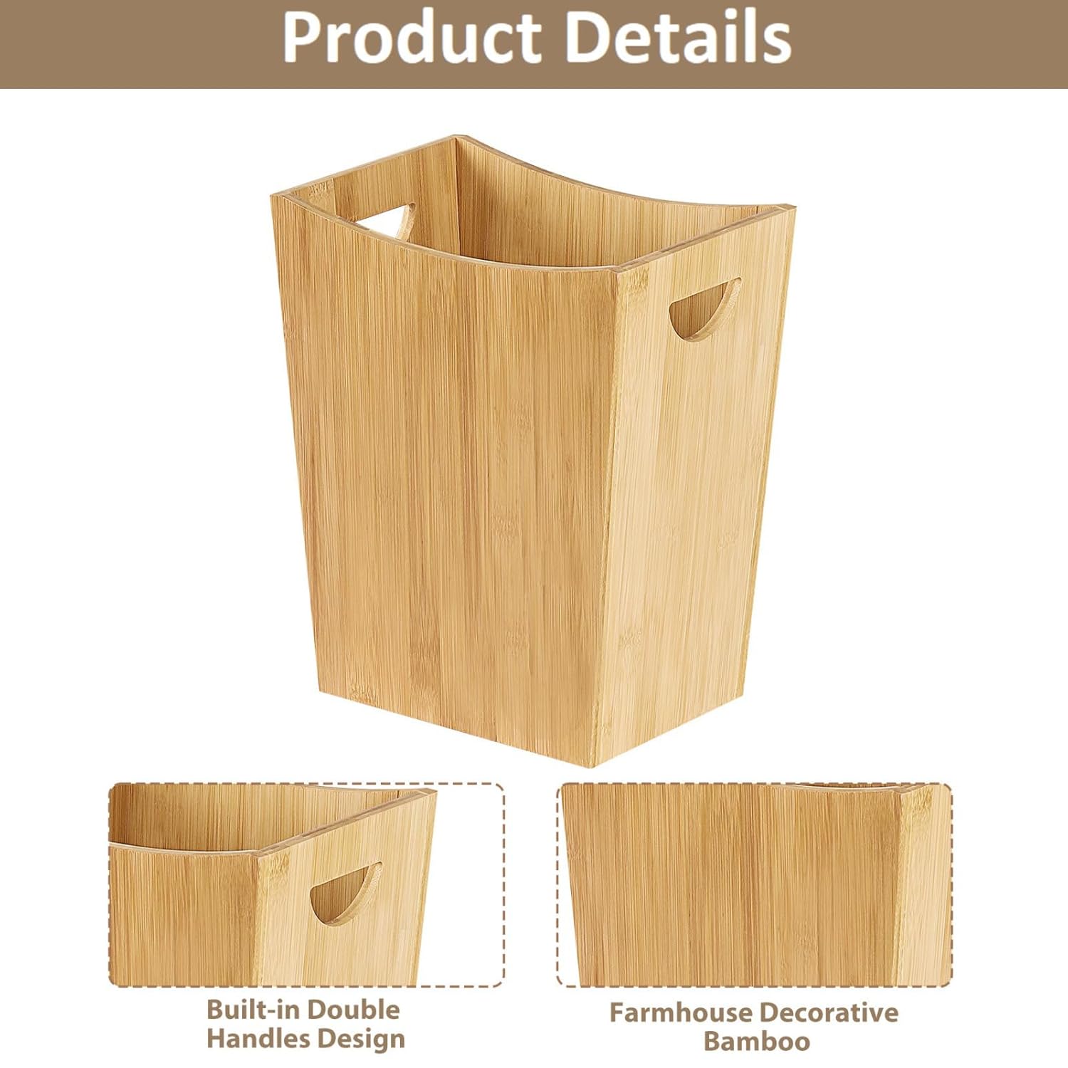 • NATURAL WOOD CONSTRUCTION: The farmhouse trash can is made from high-quality Wood that withstands long-term use. Durable and sturdy, healthy and eco-friendly, features with farmhouse bamboo texture, The rustic country design will complement your home decor and also can be recycled. The color may vary due to it being handy and made of natural Wood!