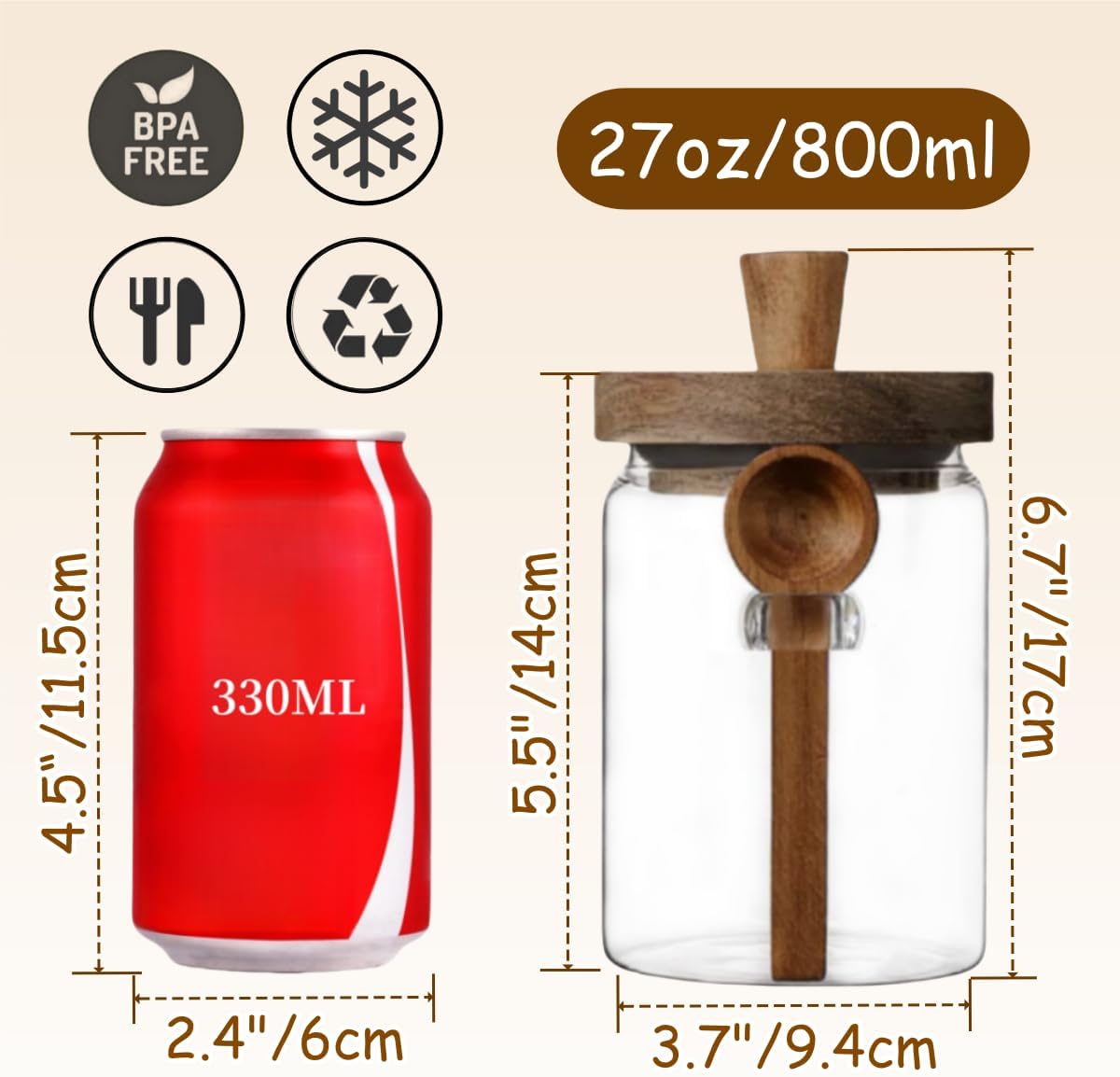 • Portable Size: Measuring 3.7''W x 5.5''H (Lid not included), our glass jar with lid boasts a convenient compact size for easy transportation. The lid with a wooden handle makes the jar easier to open, and the included wooden spoon makes it easy to scoop things out at any time