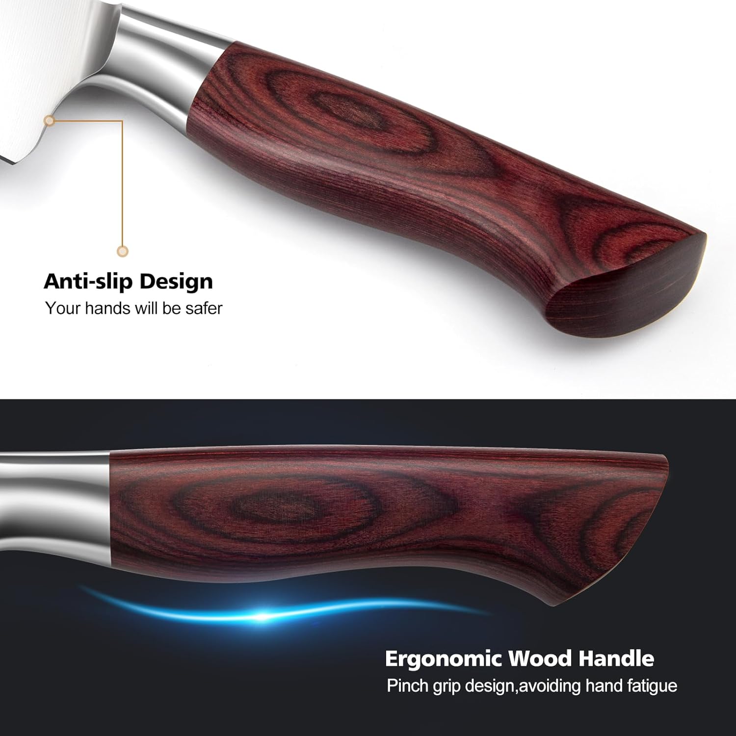 • 【Superior Design & Easy Maintain】Kitchen knife set blade is treated with a sandblasted process, Improve the texture of the knife surface, not easy to adhere to food residue. Knives set is well organized in wood knife block, ventilation design at the bottom keep tidy and space-saving.