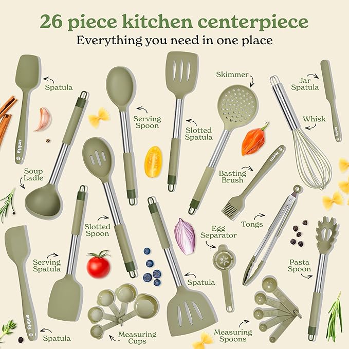 SMIRLY Kitchen Utensils Set, 26PCS Silicone Cooking Utensils Set, Spatula Set with Holder, Stainless Steel Kitchen Gadgets for Home and Kitchen