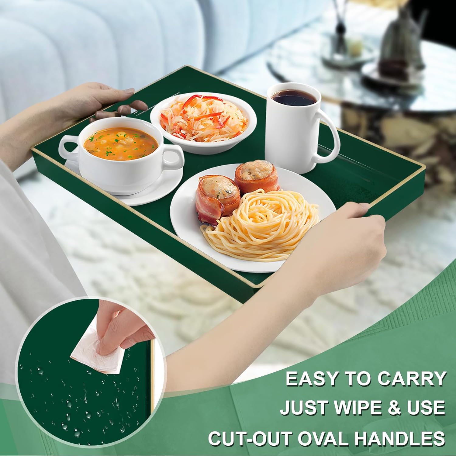 • TRAY DECOR: Dark green tray is often used to present food and drinks in an appealing and organized manner. Rectangle tray can enhance the visual appeal of the items being served, making them more enticing to guests or customers. Also place it on your bathroom vanity as an exquisite showcase for perfumes, jewelry, or bath accessories.