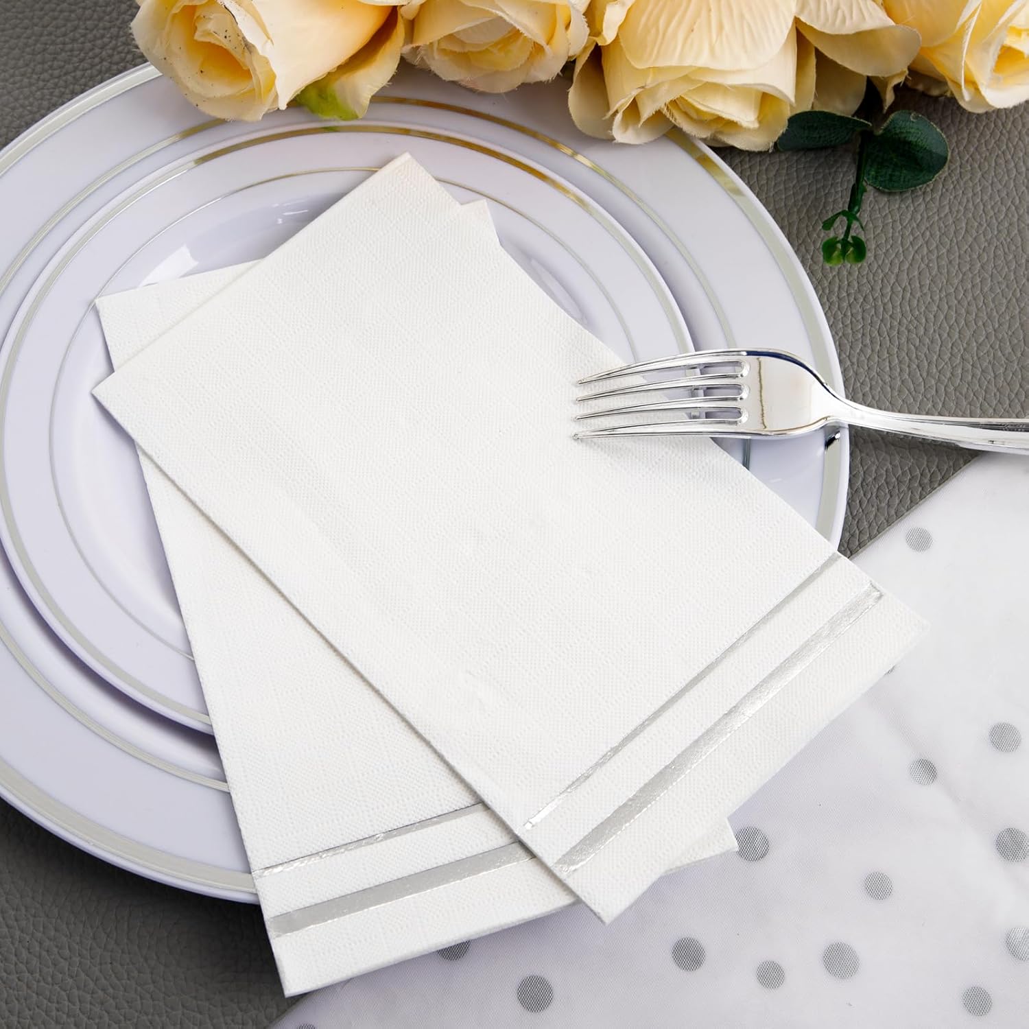 • INGENIOUS DESIGN:Silver disposable plates feature an exquisite silver trim design, adding a touch of luxury to dining occasions.Our set also includes a tablecloth, which is uniquely foiled and elegantly paired with the silver plates.Not suitable for use in microwave.