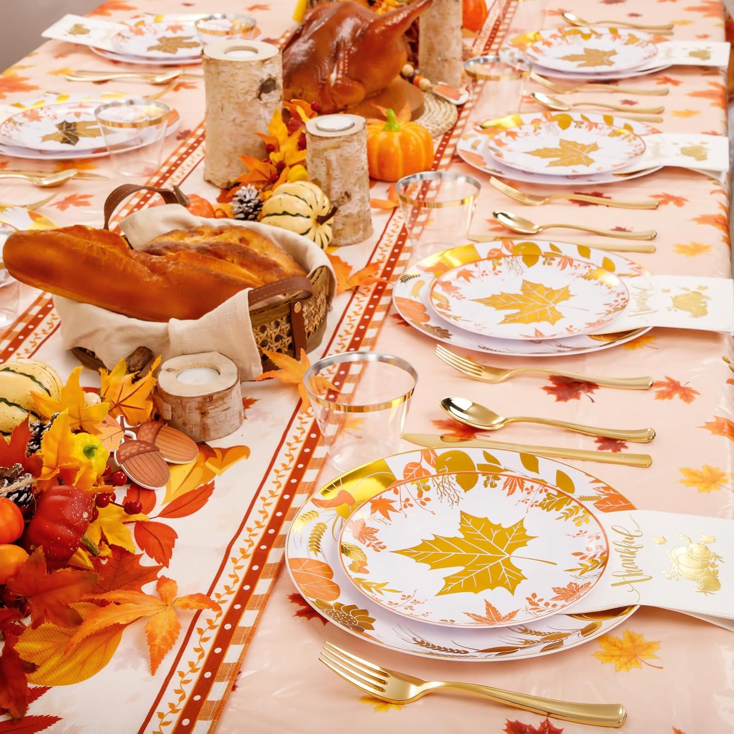 GATHER 176 Pieces Thanksgiving Plates- Disposable Gold Plastic Silverware- Thanksgiving Dinnerware with Maple Leaves Include 50 Plates 75Plastic Silverware 25Cups 25 Napkins and 1 Tablecloth