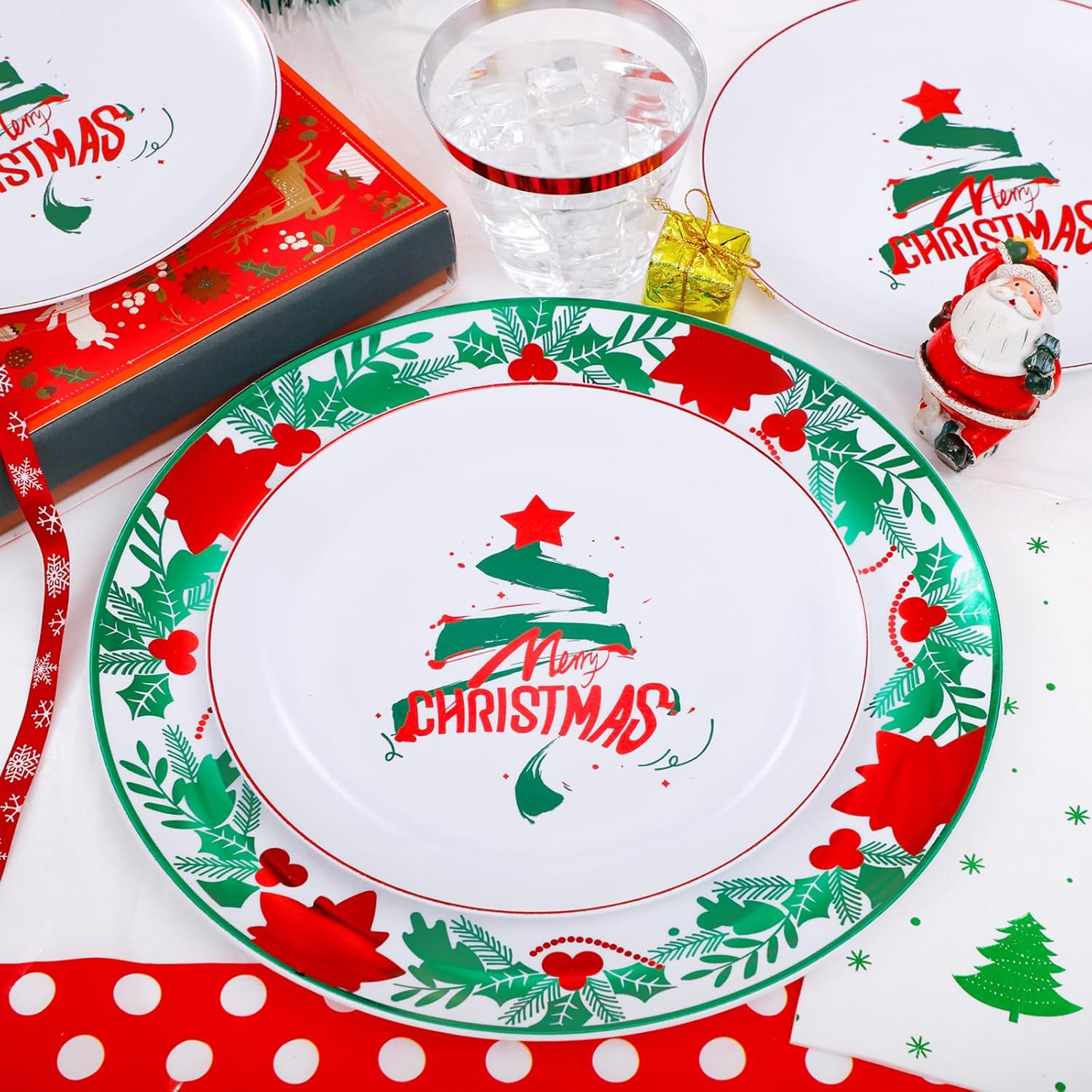 • Great Value: GATHER Christmas plates contains 50 plastic plates, 75 red plastic silverware, 25 Christmas paper napkins, and 25 red rim plastic cups, 1 plastic tablecloth. The tablecloth unfolds size 108*54 inches, the Christmas dinnerware sets can satisfy the 25 guests at one time