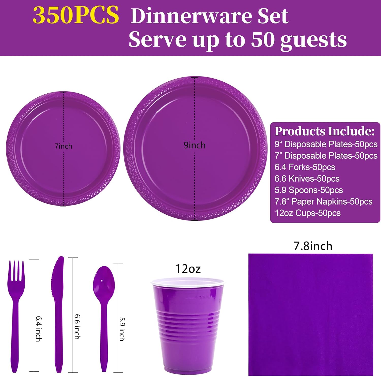 MirthMood 350Pcs Purple Party Supplies, Purple Plastic Dinnerware Set, Including Plates and Napkins, Plastic Cutlery and 12OZ Cups